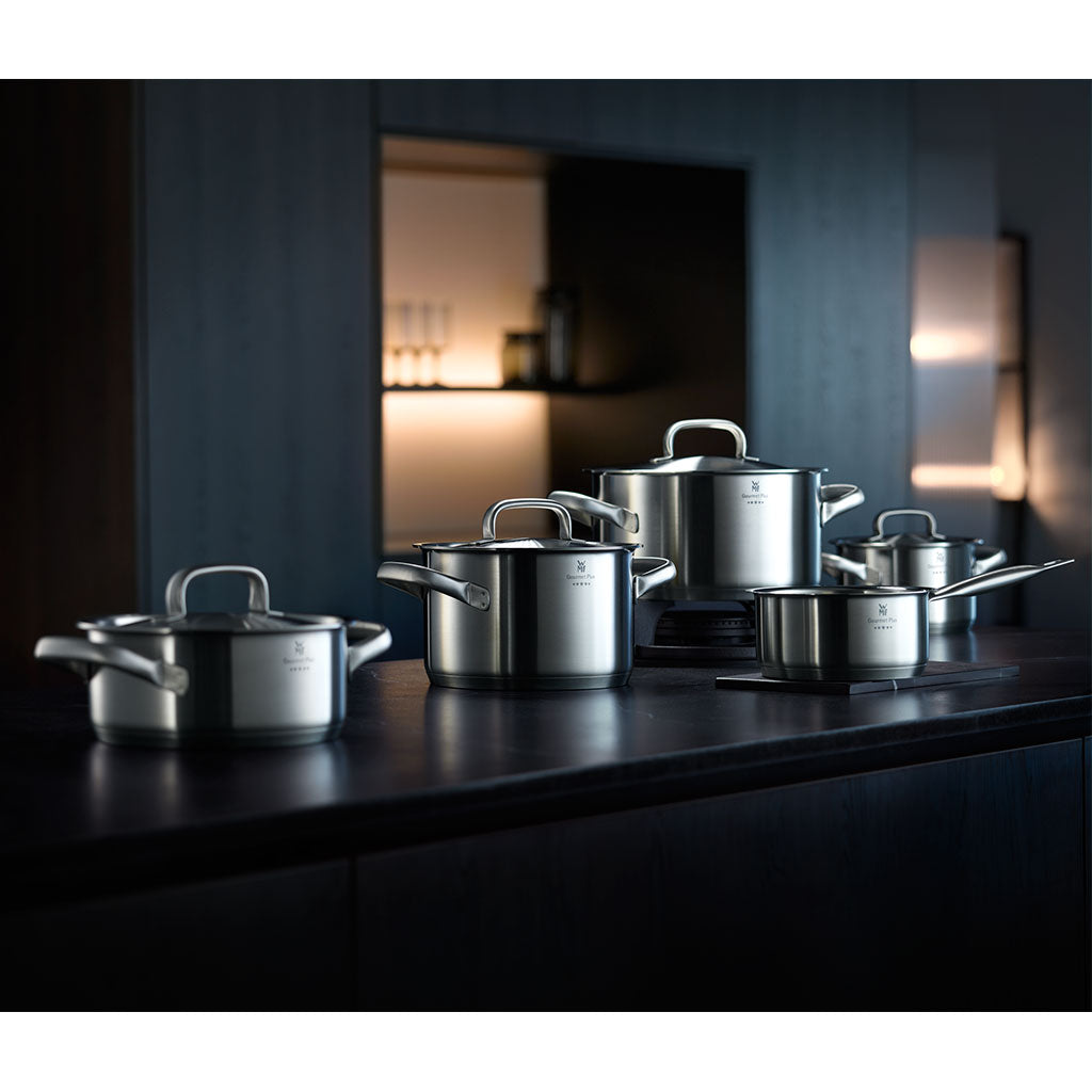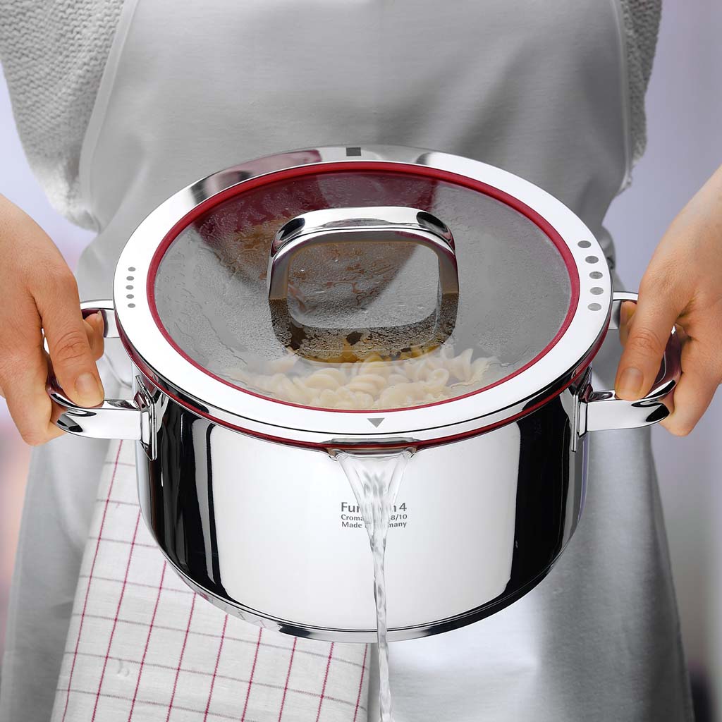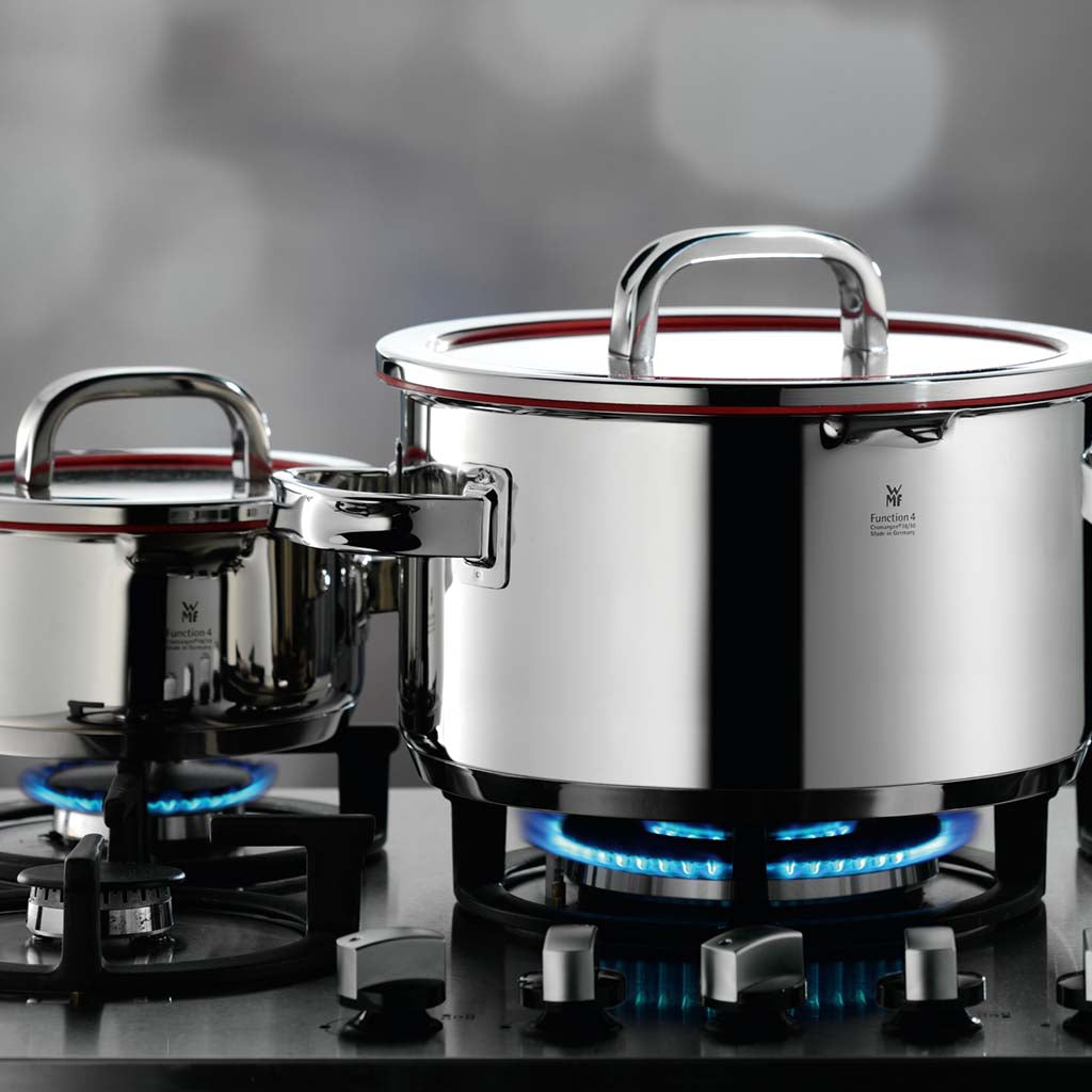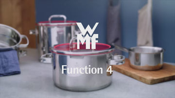Die Function 4-Serie besteht aus Cromargan®-Edelstahl 18/10 . Dadurch wird das Geschirr robuster, kratzfester und pflegeleichter. Die Batterie besteht aus vier der am häufigsten verwendeten und vielseitigsten Teile in der Küche: