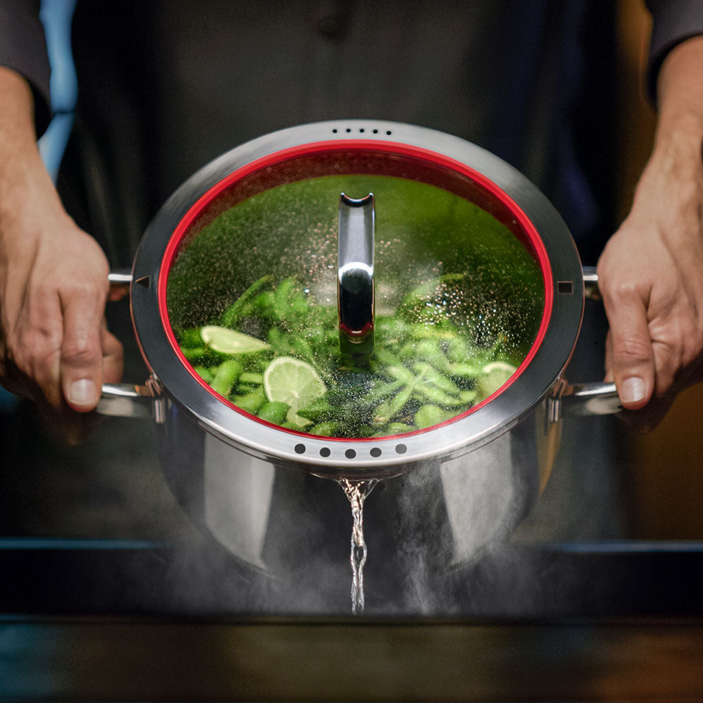 Die hervorragende Wärmeverteilung des TransTherm® - Bodens trägt zu einer schnelleren Erwärmung, einer gleichmäßigen Verteilung und einer hervorragenden Temperaturerhaltung bei. Mit dem transparenten Glasdeckel können Sie den Garvorgang kontrollieren, ohne ihn anheben zu müssen, und dank der Silikondichtung bleiben Dampf und Hitze erhalten. Sie können sehr effizient und mit weniger Energieverbrauch kochen.