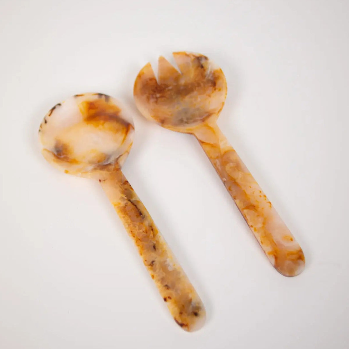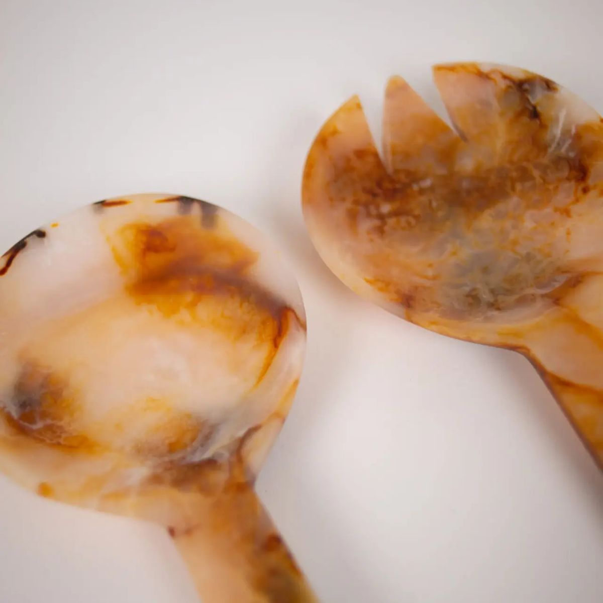 Debido a la naturaleza de la resina, cada cubierto para ensalada destaca por unos matices y vetas distintas, lo que hace de todos piezas únicas e irrepetibles.