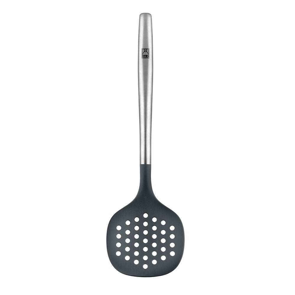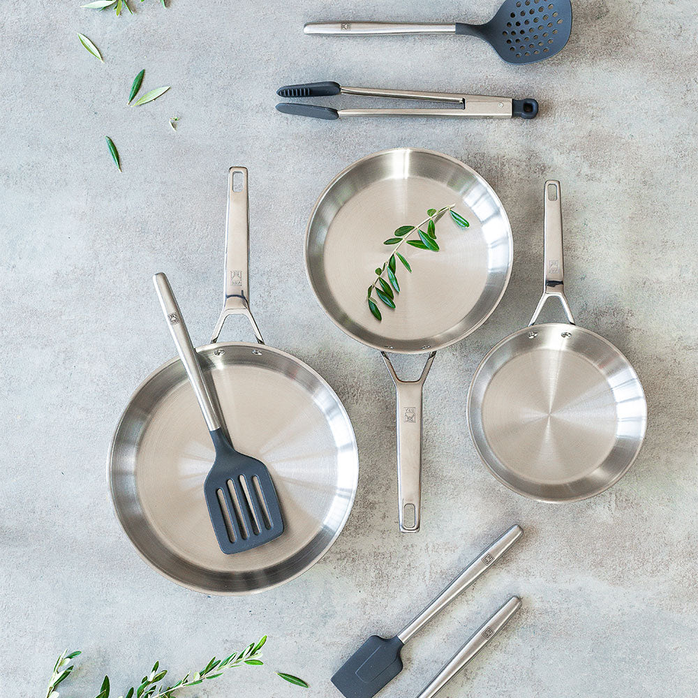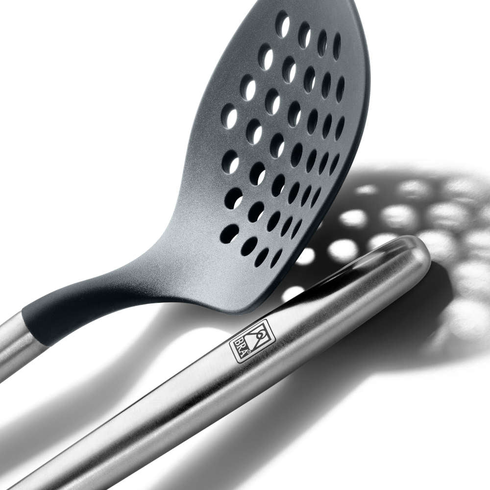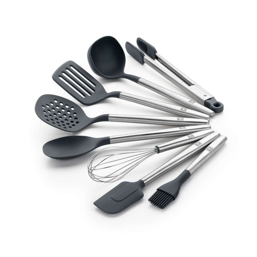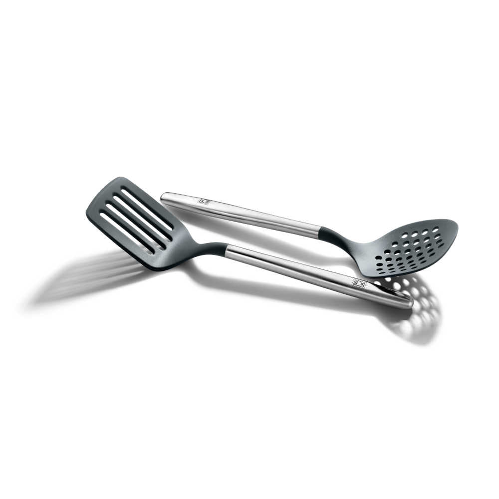 Alle Utensilien des Set Signature sind Hergestellt aus hochwertigem 18/10 Edelstahl sowie widerstandsfähigem und langlebigem Silikon und Nylon, und vollständig lebensmittelecht. Der ergonomische Griff erleichtert die Handhabung. Sie sind groß und lang, perfekt zum Umrühren, Wenden, Servieren oder Abtropfen von Lebensmitteln – einfach, bequem und sicher. Das Set besteht aus: