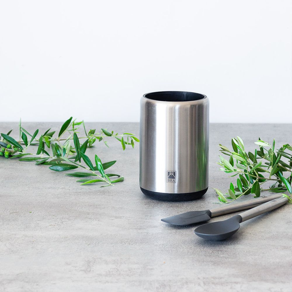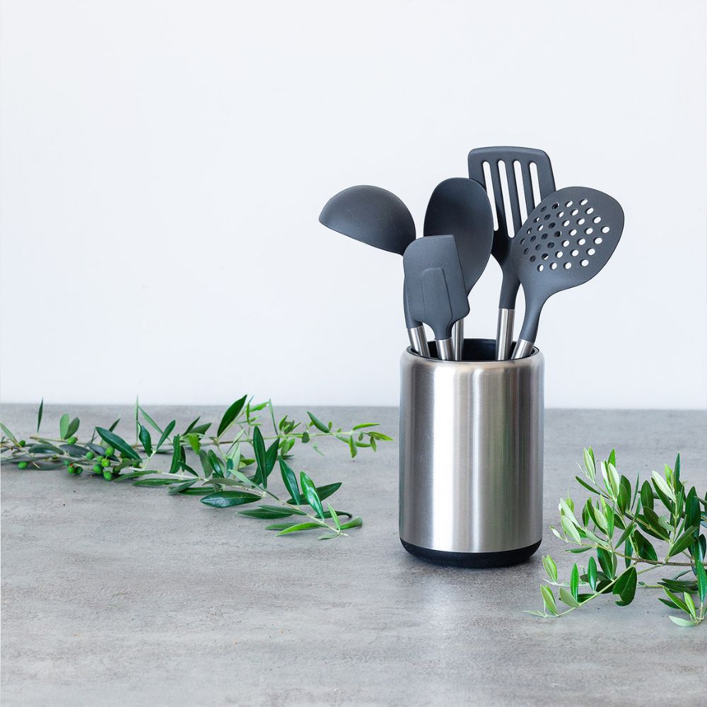 Der Behälter besteht aus Edelstahl mit Polypropylen-Innenraum und Trennwänden. Mit Platz für bis zu 15 Utensilien verfügt er über 3 Fächer, die ideal sind, um dir die Organisation all deiner Werkzeuge zu erleichtern. Du hast sie nicht nur gut geordnet und die Arbeitsfläche bleibt frei, sondern sie sind auch immer griffbereit, bereit, wenn du sie brauchst.