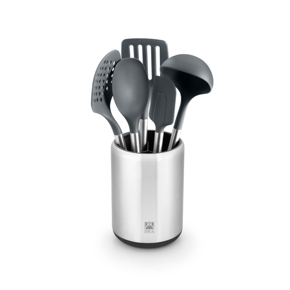 Das 5-teilige Utensilien-Set mit Signature Bra Behälter ist ein komplettes Set aus 6 Teilen perfekt, um deine Küche auszustatten und sie immer ordentlich zu halten. Das Set es enthält 5 unverzichtbare Utensilien, mit denen du deine Rezepte zubereiten und servieren kannst, und außerdem einen Utensilienbehälter mit 3 Fächern, damit deine Werkzeuge immer ordentlich und griffbereit sind, bereit zur Verwendung, wenn du sie brauchst.