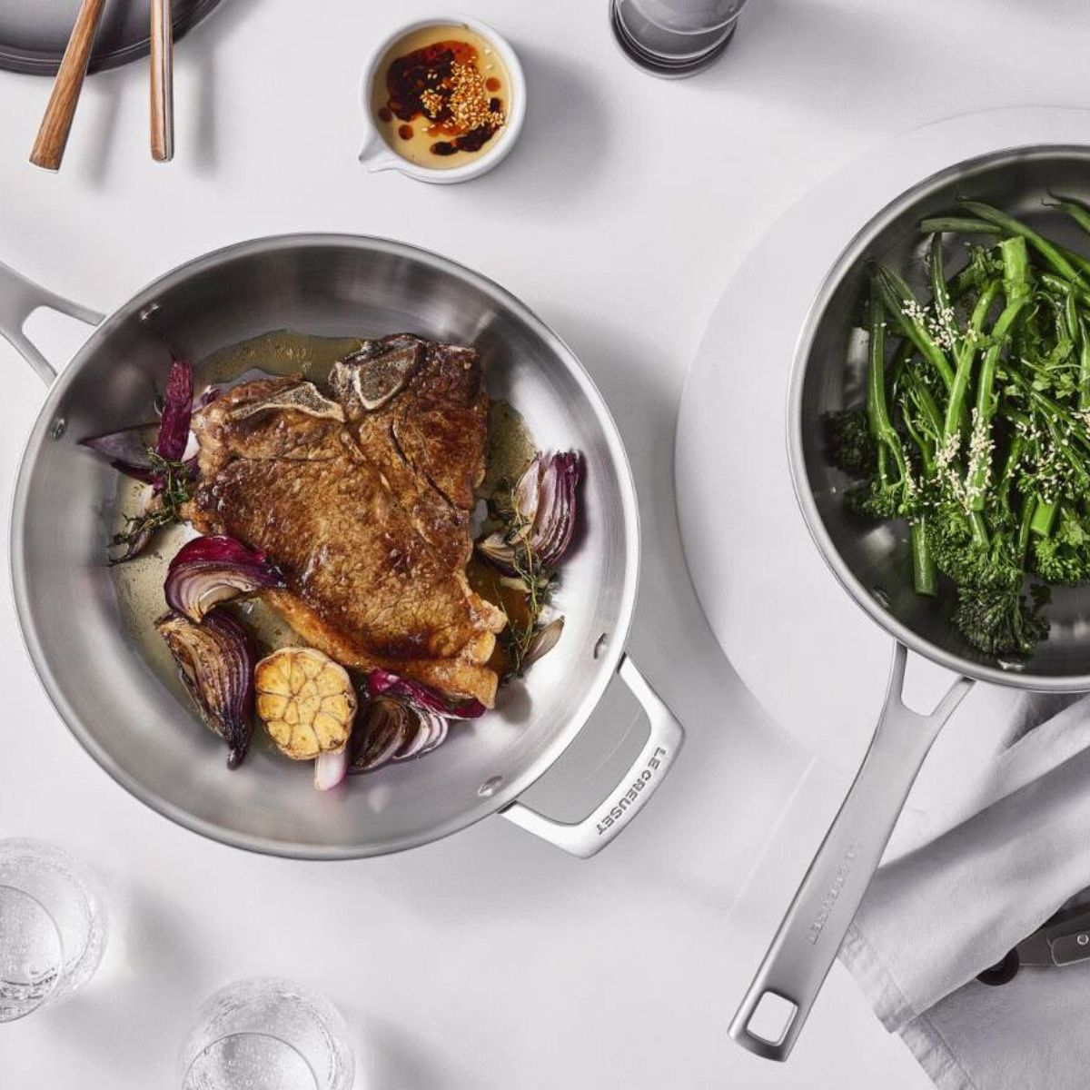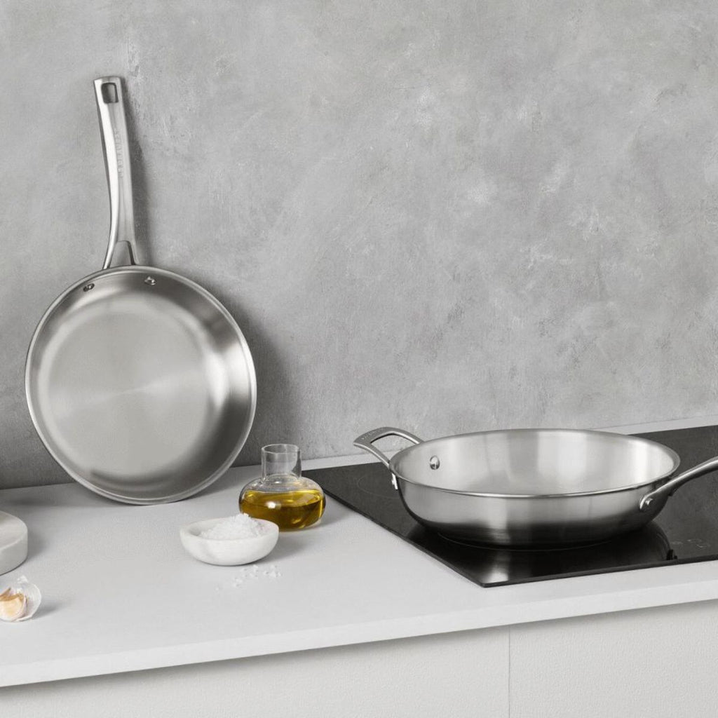 Möchtest du ein unschlagbares Duo für meisterhaftes Kochen? Mit dem Set aus 2 Edelstahl-Bratpfannen Tricapa 3-PLY von Le Creuset erhältst du zwei hochwertige und langlebige Pfannen, mit denen du deine besten Rezepte zubereiten kannst. Das Set enthält eine 24 cm und eine 28 cm Pfanne, beide aus Edelstahl mit 3-Schicht-Konstruktion, komfortabel im Gebrauch und äußerst funktional – perfekt für den täglichen Einsatz. Dank dieser Mehrschichtbauweise erhitzen sich die Pfannen schneller und gleichmäßiger vom Boden bis zum Rand.
