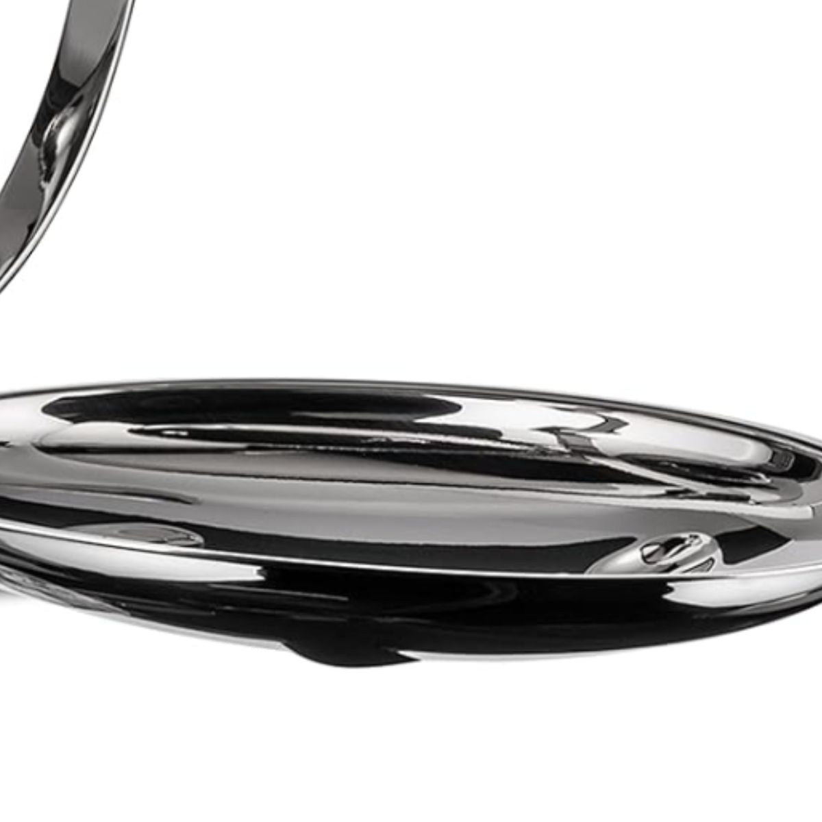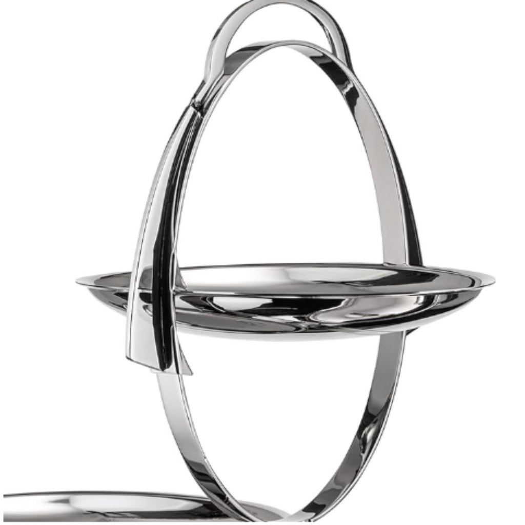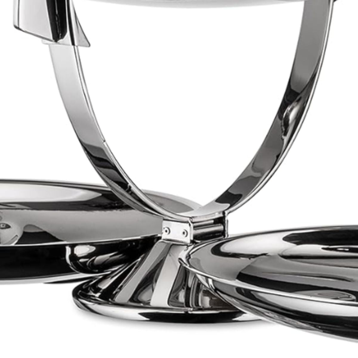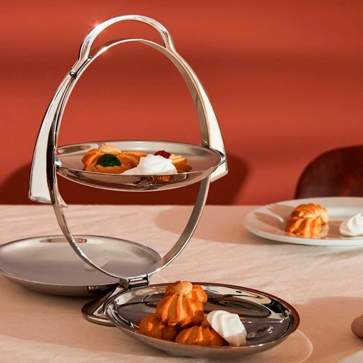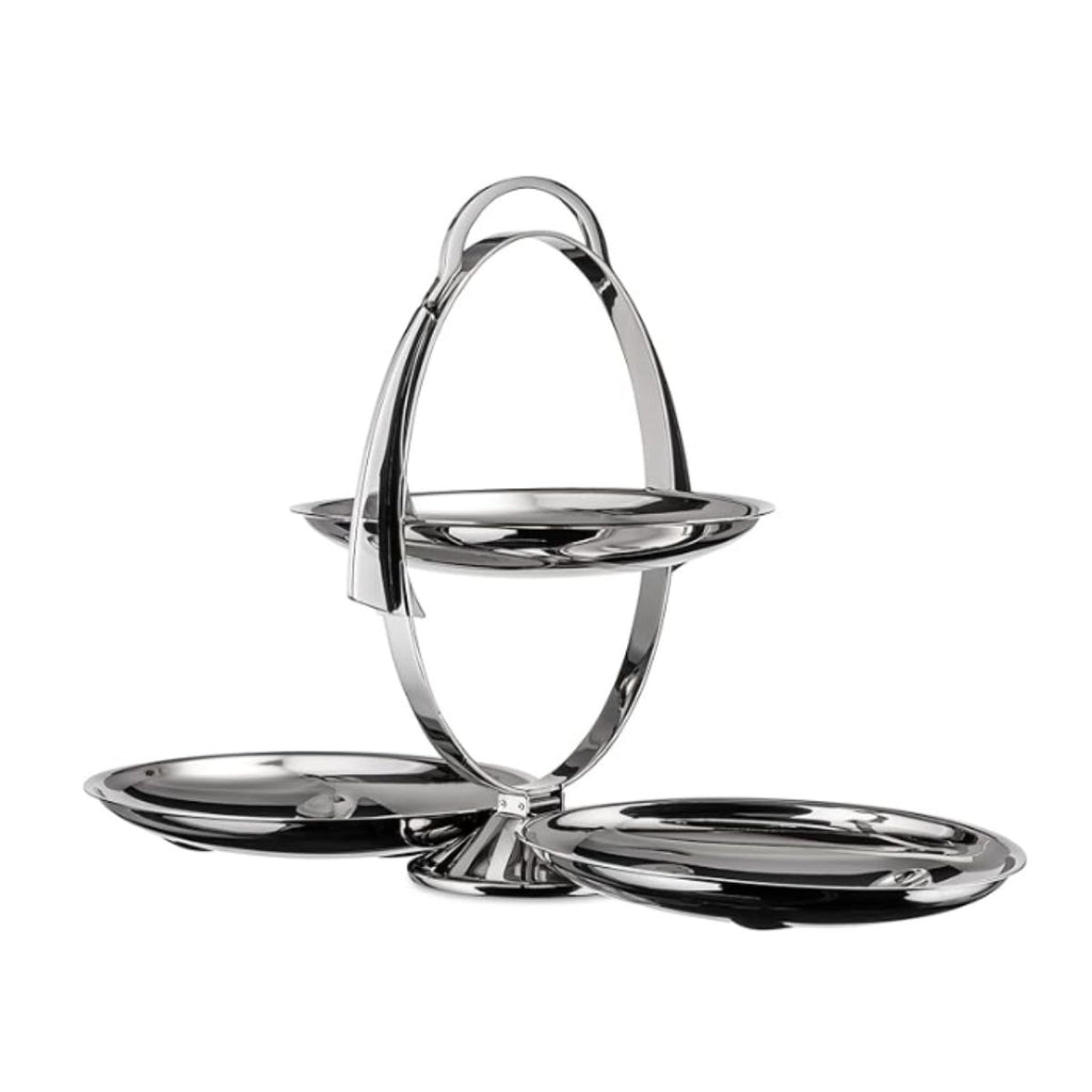 Das Design dieses Tortenständers ist einfach verblüffend. Er besteht aus drei klappbaren Etageren aus Edelstahl, die durch eine gemeinsame Struktur miteinander verbunden sind. Wenn du sie nicht mehr brauchst, klappst du sie zusammen, und sie verwandeln sich in eine faszinierende, skulpturale Figur.