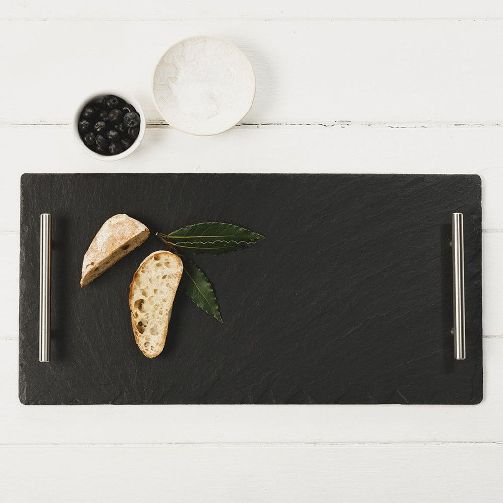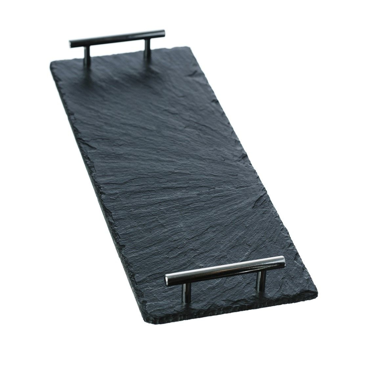 Das Serviertablett aus Schiefer mit Edelstahlgriffen von Selbrae ist ein beeindruckendes Stück, das du in deiner Küche und auf deinem Tisch haben möchtest. Dieses Tablett aus natürlichem Schiefer, handgefertigt in Schottland, verfügt über zwei erhöhte, röhrenförmige Griffe aus Edelstahl, ideal zum sicheren und bequemen Tragen. Ein perfektes Tablett, um alles zu präsentieren – von Canapés, Käse, Pasteten, herzhaften Tartes, Wurstwaren bis hin zu Desserts, Keksen, Getränken oder dem kompletten Kaffeeservice. Ein einzigartiges Tablett mit fabelhaftem Design und handwerklichem Schnitt.