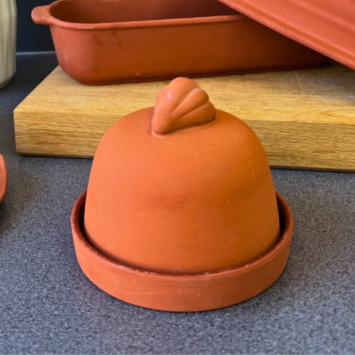 Der Ofen ist aus Terrakotta gefertigt und innen glasiert. Dank der Glasur lässt er sich sehr leicht reinigen – einfach mit warmem Wasser und Seife abspülen und gut trocknen.