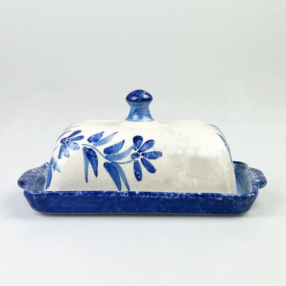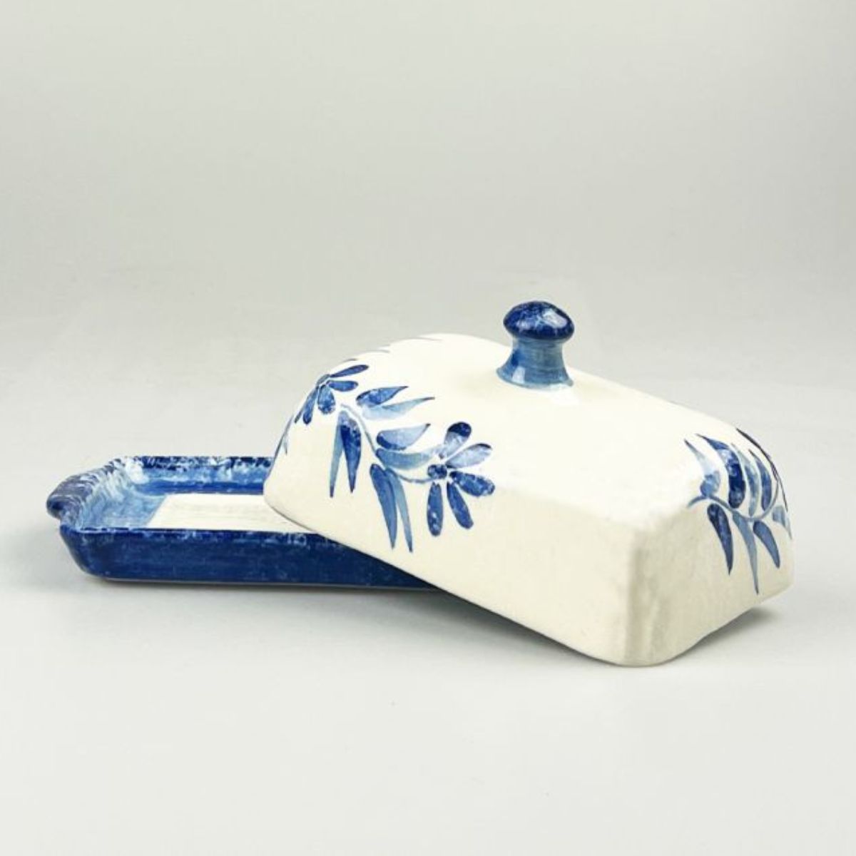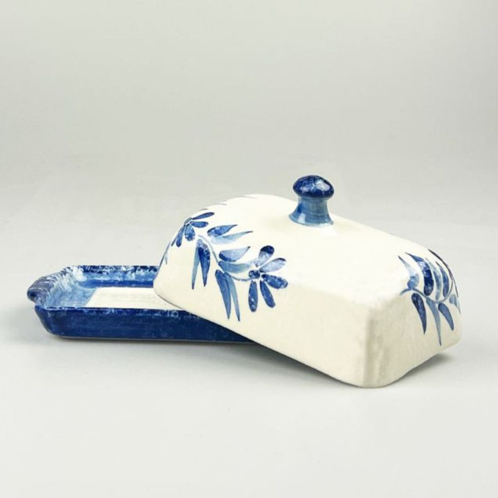 Die Butterdose aus Keramik vereint meisterhaft das traditionelle Design einer Schale mit Deckel mit einem von Hand zart bemalten Olivenmuster. Die Farben Weiß und Blau strahlen Ruhe aus und machen die Butterdose zu einem Hingucker – ob beim Frühstück oder zu jedem anderen Anlass. Da sie handgefertigt und handbemalt ist, ist jede Butterdose ein Unikat.