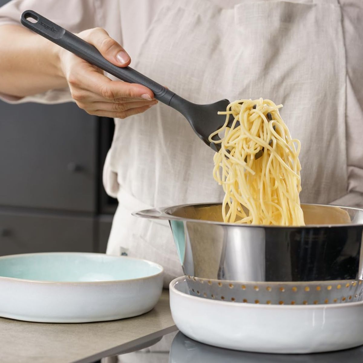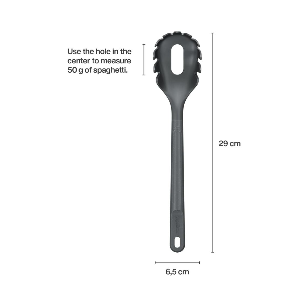 Der Spaghettilöffel von Zyliss wurde entwickelt, um eine der klassischsten Bewegungen in der Küche zu erleichtern: Pasta zu servieren. Dank seines funktionalen Designs mit breiten und gebogenen Zinken nimmt er Spaghetti (und andere lange Nudeln) perfekt auf und hält sie fest, ohne dass sie entkommen. Außerdem verfügt er über ein zentrales Abtropfloch, mit dem überschüssiges Wasser in einem einzigen Schritt abfließen kann.
