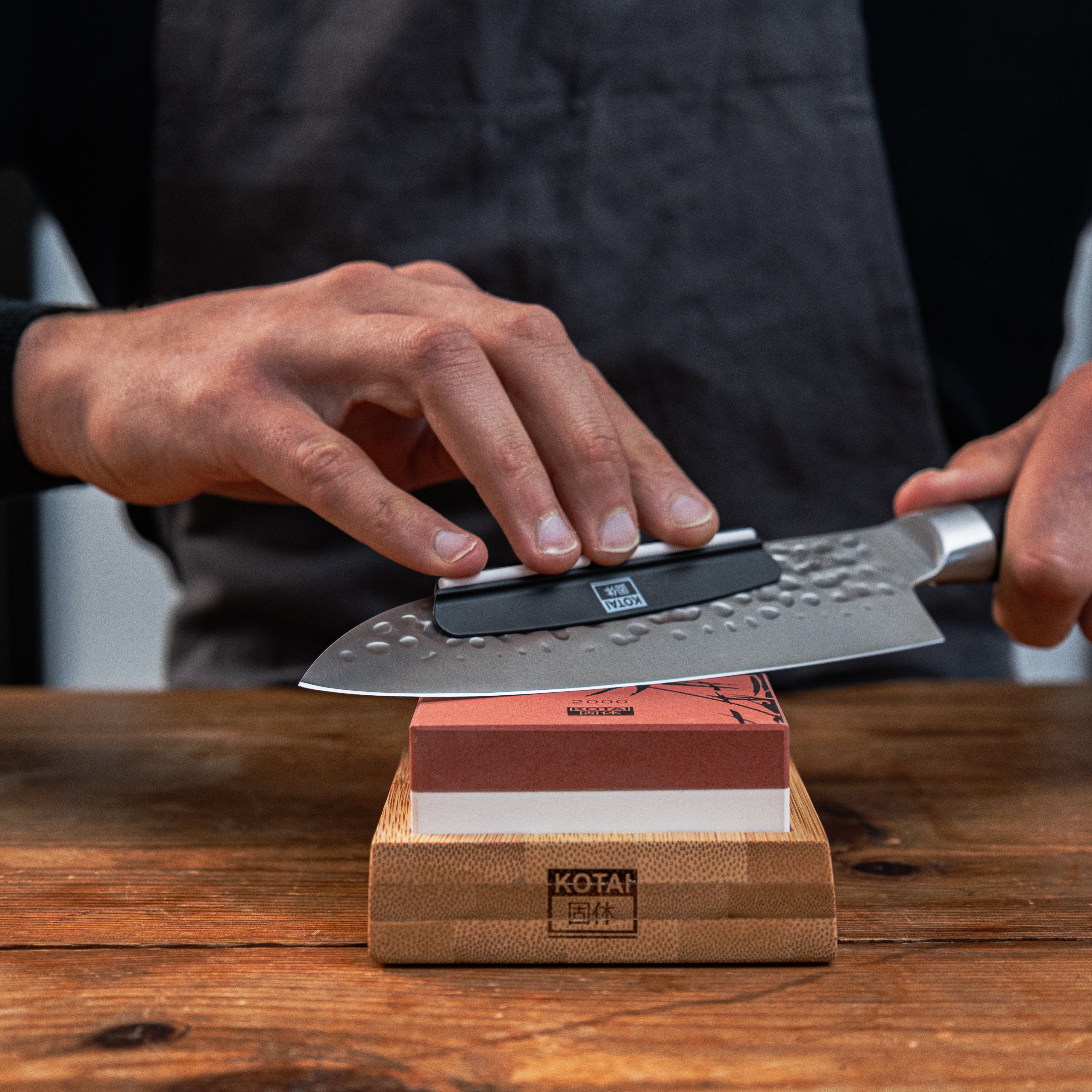 Der Messerschärfstein und das Schleifset von Kotai ist das Werkzeug, das du brauchst, um deine besten Messer stets scharf und bereit für den präzisesten Schnitt zu halten. Das Schleifset enthält eine Bambusbasis, eine Schleifführung, einen Abziehstein und einen doppelseitigen Keramikstein, der zwei Körnungen kombiniert und dir hilft, den Schliff deiner Messer zu schärfen und zu perfektionieren.