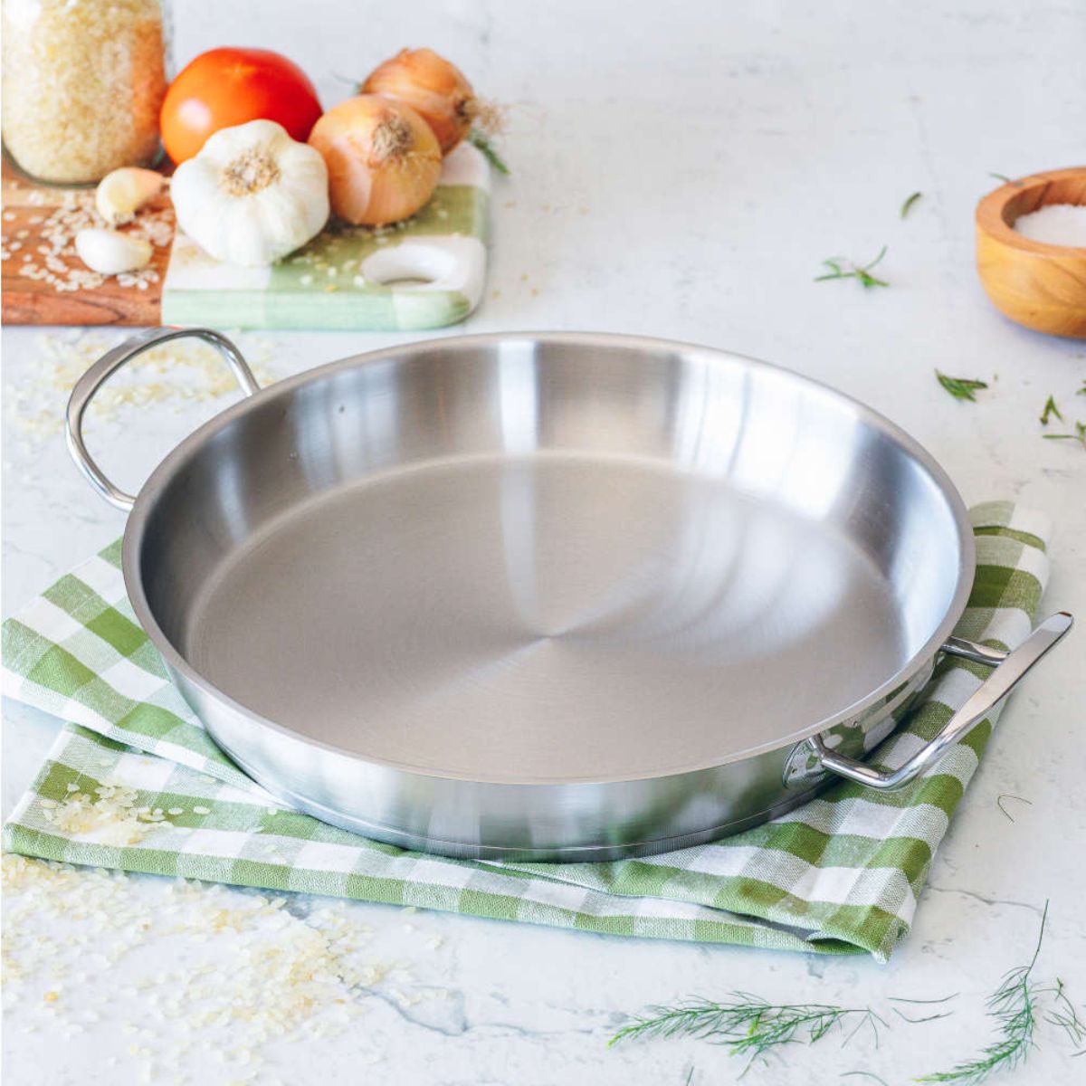Si quieres preparar tus mejores arroces, con la Paellera de acero inoxidable Profesional Bra lo vas a tener muy fácil. Gracias a su rápido calentamiento y su amplia base, cocinarás con esta paellera de forma muy eficiente. Y además tiene otra gran virtud y es su versatilidad. No solo tienes una paellera de inox excelente y 100% natural, sino que esa amplia base proporciona una gran superficie para cocinar a la plancha carnes y pescados, para saltear verduras, para marcar mariscos, para hornear masa y pizzas, o para asar en el horno todo tipo de alimentos o gratinar tus platos de pasta. ¡Una pieza enormemente funcional y duradera!