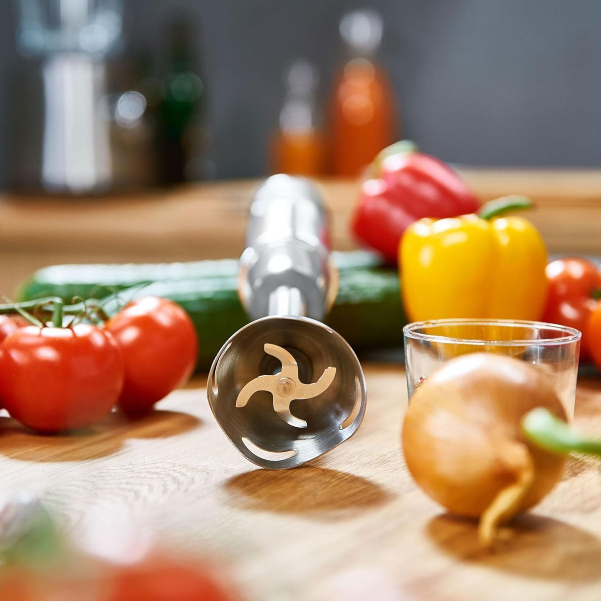 Enthält sämtliches Zubehör, das du für deine Küchenvorbereitungen benötigst: vom Food Processor-Aufsatz mit 3L Fassungsvermögen, dem Messbecher mit 800 ml, damit du die Mengen deiner Rezepte einfach kontrollieren kannst, dem Zerkleinerer mit 500 ml, mit dem du eine große Vielfalt an Zutaten mühelos hacken kannst, bis hin zum Schneebesen-Aufsatz, mit dem du Eiweiß aufschlagen, Sahne zubereiten oder deine Mischungen mühelos verrühren kannst.