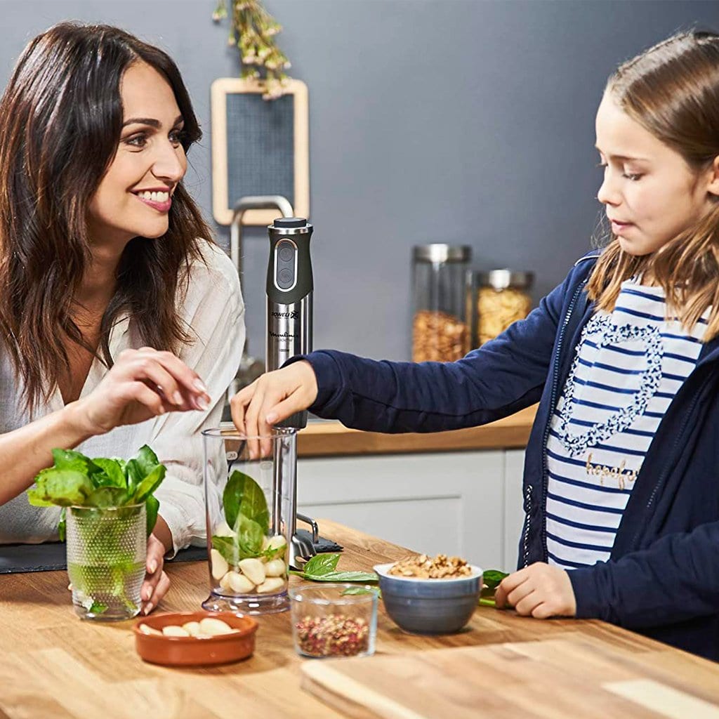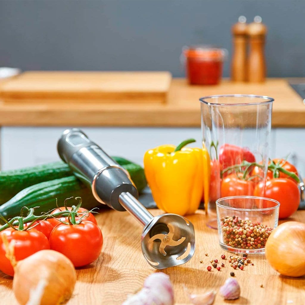 Du kannst die Option mit dem Mixer und dem Messbecher wählen oder die Set-Option mit Zubehör, sodass du zu Hause ein echtes multifunktionales Set für alle Arten von Zerkleinerungen und verschiedene Mengen hast.