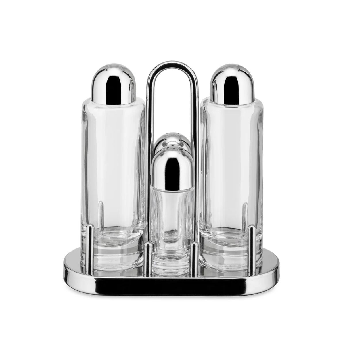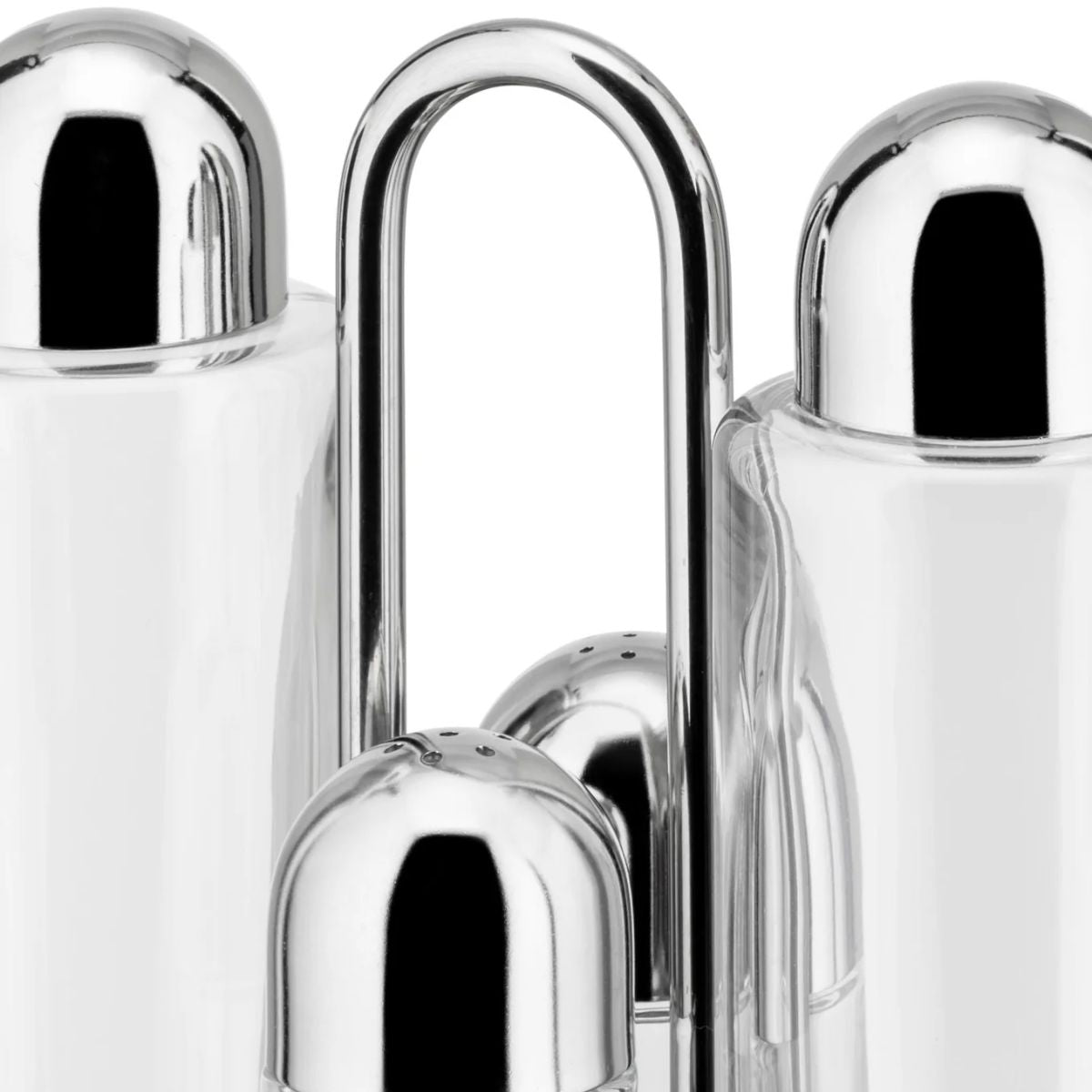 Mit diesem 4-teiligen Gewürzset aus Edelstahl von Alessi hast du Öl, Essig, Salz und Pfeffer an einem Ort ordentlich verstaut und kannst sie bequem auf den Tisch bringen, damit sich jeder sein Essen nach Belieben würzen kann. Es ist viel praktischer, alles in einem Set zu haben, als vier einzelne Teile separat zu transportieren.