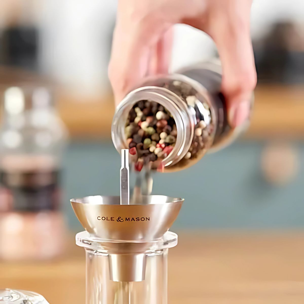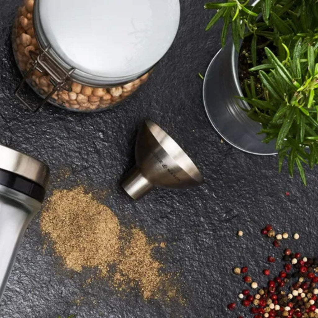 Der kleine Edelstahltrichter für Cole&Mason Mühlen ist ein großartiger Helfer, der dafür entwickelt wurde, Ihnen das einfache Nachfüllen Ihrer Gewürz- und Soßengläser sowie Ihrer Salz-, Pfeffer- oder Kräutermühlen zu erleichtern. Er ist hygienisch, langlebig und robust. Seine schmale Öffnung passt problemlos in die Nachfüllöffnung der Mühle, des Behälters oder der Flasche, sodass nichts verschüttet oder verschmutzt wird. Und dank seiner kompakten Größe können Sie ihn problemlos in jeder Schublade aufbewahren.