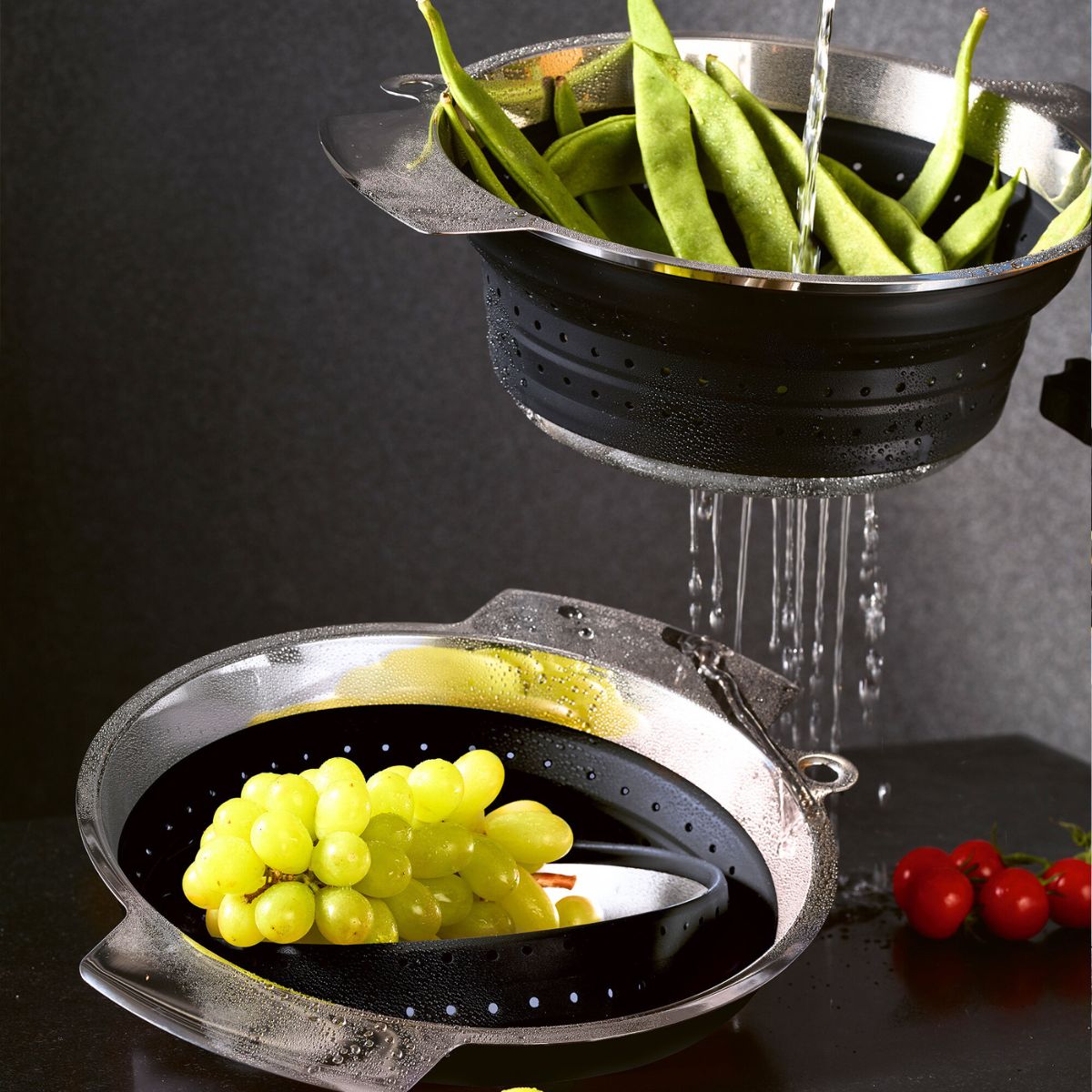 Das Original und von hoher Qualität! Mit diesem schwarzen faltbaren Rösle-Sieb kannst du nicht mehr sagen, dass du keinen Platz zum Verstauen hast oder dass in deiner Küche kein weiteres Teil mehr hineinpasst. Dieses großartige Sieb ist aus Edelstahl und Silikon gefertigt und perfekt zum Abtropfen von Gemüse, Pasta oder Salat. Nach der Benutzung kannst du es problemlos in den Geschirrspüler geben und zusammengefaltet bis zum nächsten Gebrauch verstauen.