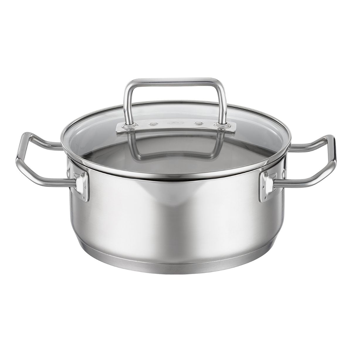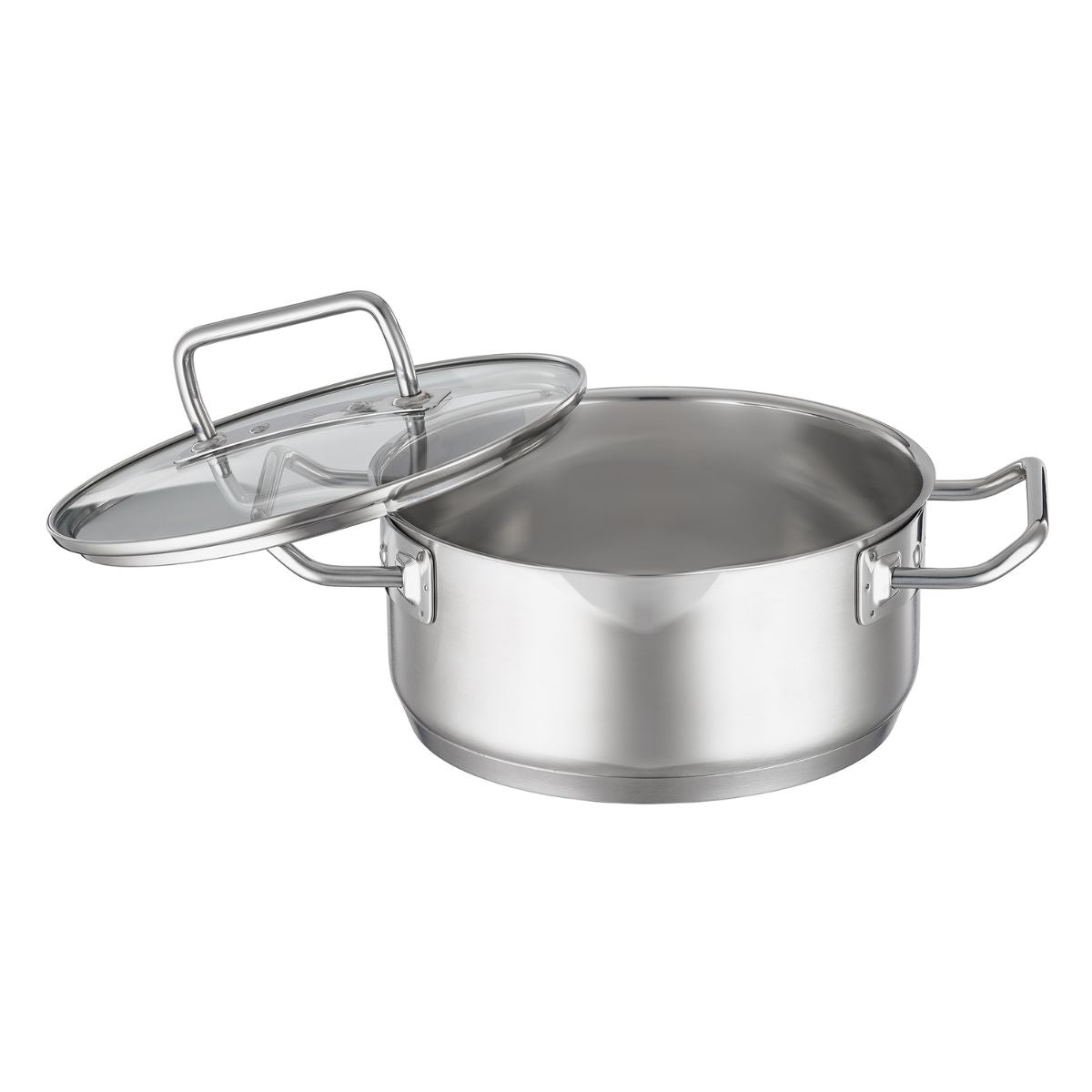 Robust, elegant, funktional und aus hochwertigen Materialien gefertigt – diese niedrige Kasserolle aus 18/10 Edelstahl mit gehärtetem Glasdeckel ist ein echtes Schmuckstück, mit dem du bequem und wunderbar kochen wirst – und das ein Leben lang.
