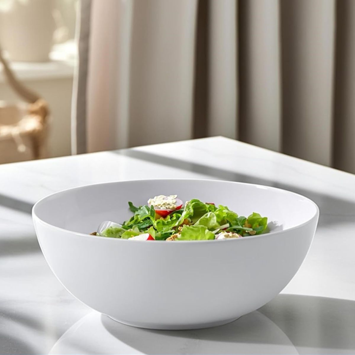 Hergestellt aus Premium-Bone-Porzellan, besticht sie durch ihr zartes Aussehen, ihr reines Weiß und ihre feine Haptik und zeichnet sich gleichzeitig durch hohe Widerstandsfähigkeit aus, selbst bei täglichem Gebrauch. Außerdem hält das Porzellan die Temperatur wunderbar, weshalb diese Salatschüssel eine ausgezeichnete Wahl ist, um deine frischen Salate, Kühlschrankdesserts oder warme Beilagen zu servieren,
