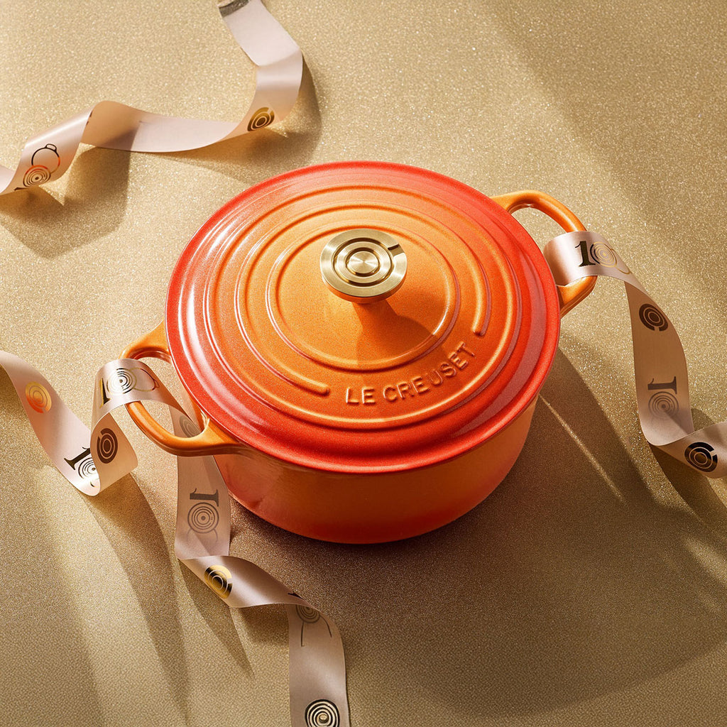 Es gibt keinen besseren Anlass, sich in Schale zu werfen, als Geburtstage zu feiern. Und wie es sich gehört, trägt die Le Creuset Sonderedition Runde Gusseisen-Cocotte zum Jubiläum ihr festlichstes Gewand, um das 100-jährige Jubiläum von Le Creuset zu feiern.