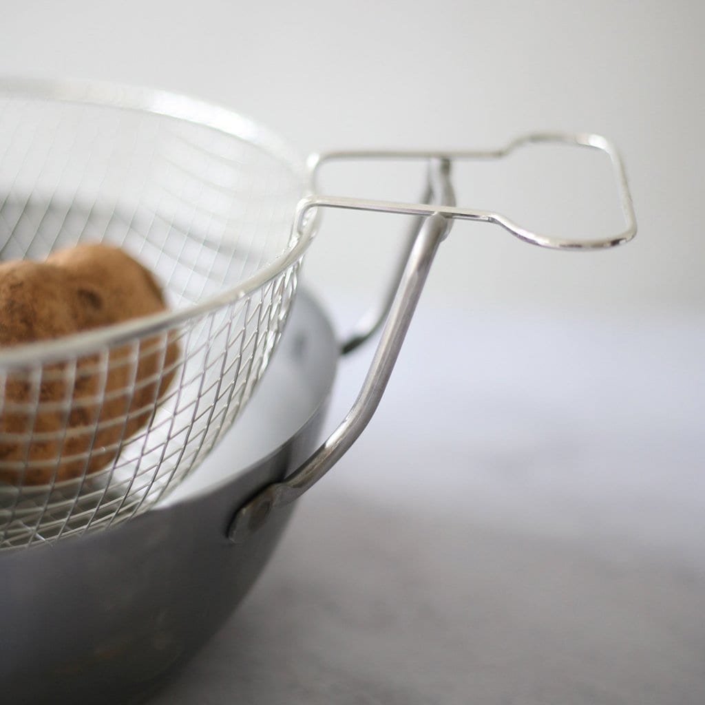Das Sieb ergänzt die Eisenpfanne perfekt. Es ist aus hochwertigem Edelstahl gefertigt und so konzipiert, dass es erhöht gehalten werden kann, indem es an den Griffen der Pfanne eingehängt wird, um das Frittiergut nach dem Frittieren abtropfen zu lassen.