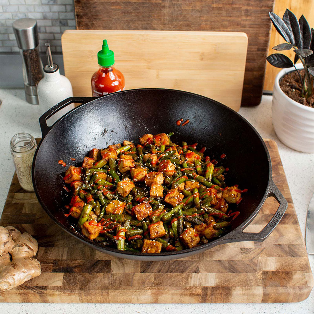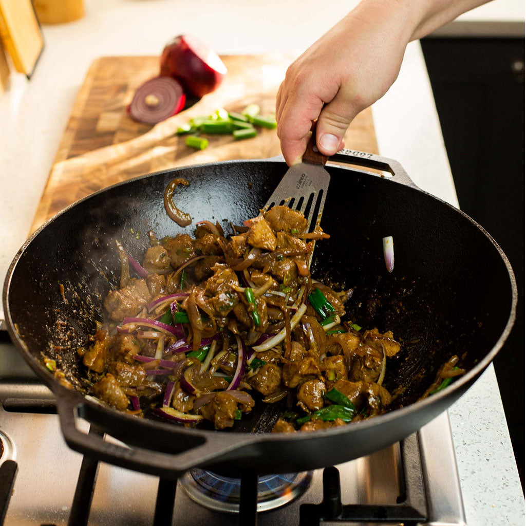 Mit seinem beeindruckenden Design ermöglicht Ihnen der Lodge Iron Wok , wie ein Zauber zu kochen. Dieser 35 cm große Wok besteht aus Gusseisen und bietet eine hervorragende Wärmespeicherung und eine gleichmäßige Temperaturverteilung im gesamten Körper. Sie können sautieren, bräunen, braten, schmoren, rösten, köstliche Eintöpfe bei schwacher Hitze kochen und auch alle Arten von Gerichten und Teigen backen . Dank seines flachen Bodens können Sie ihn überall dort verwenden, wo Sie damit kochen möchten.
