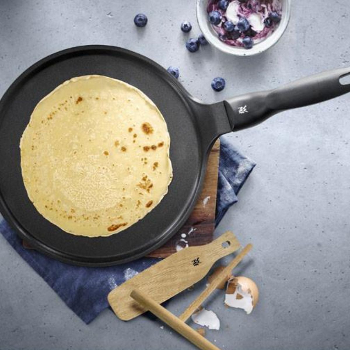 The WMF Permadur Non-Stick Crepe Pan is a truly versatile helper. With this wonderful Set you can easily and conveniently prepare delicious crêpes, without worrying about them sticking. The Set includes, in addition to the pan for your crepes and pancakes, a wooden spreader to distribute the batter and a wooden spatula to flip the crepe with ease.
