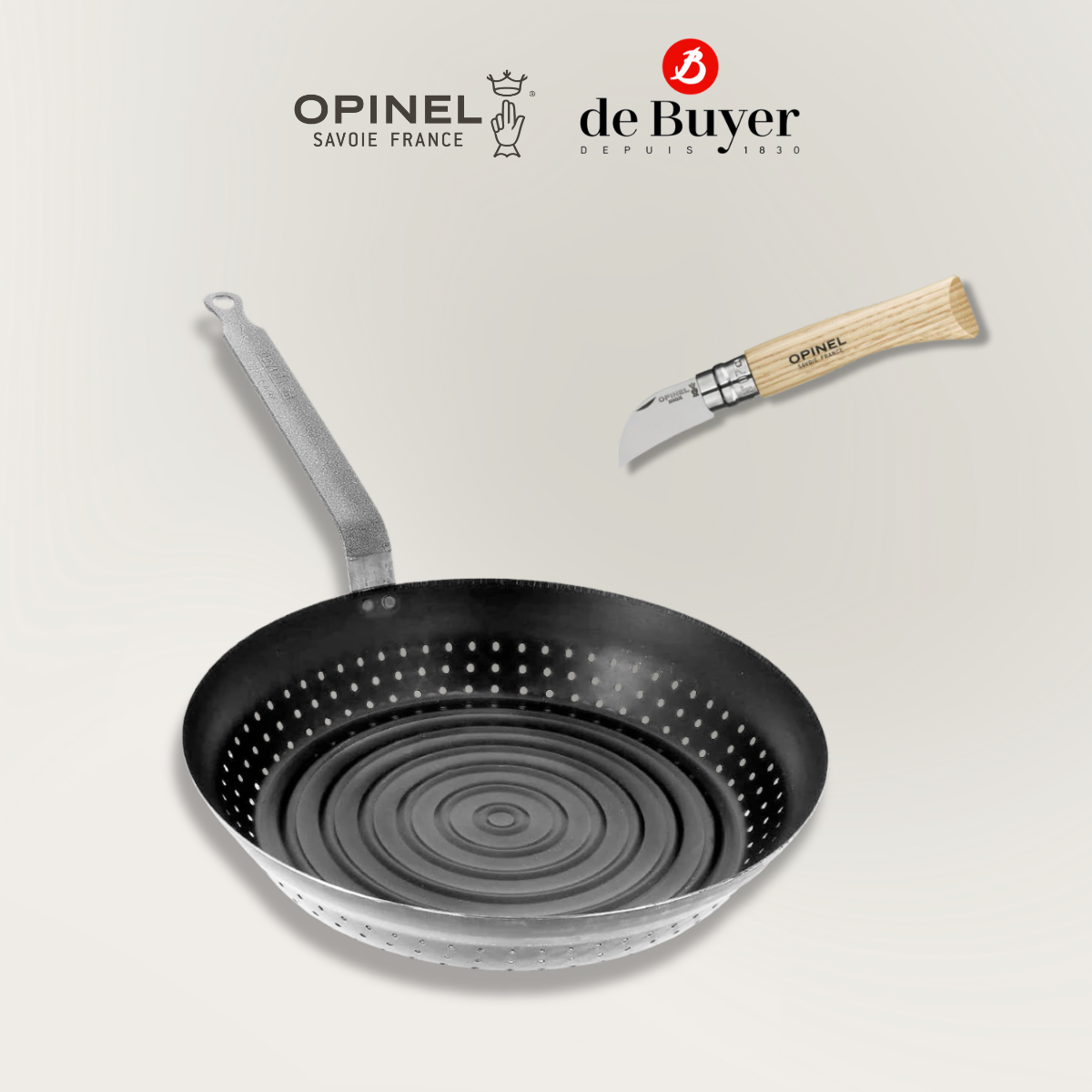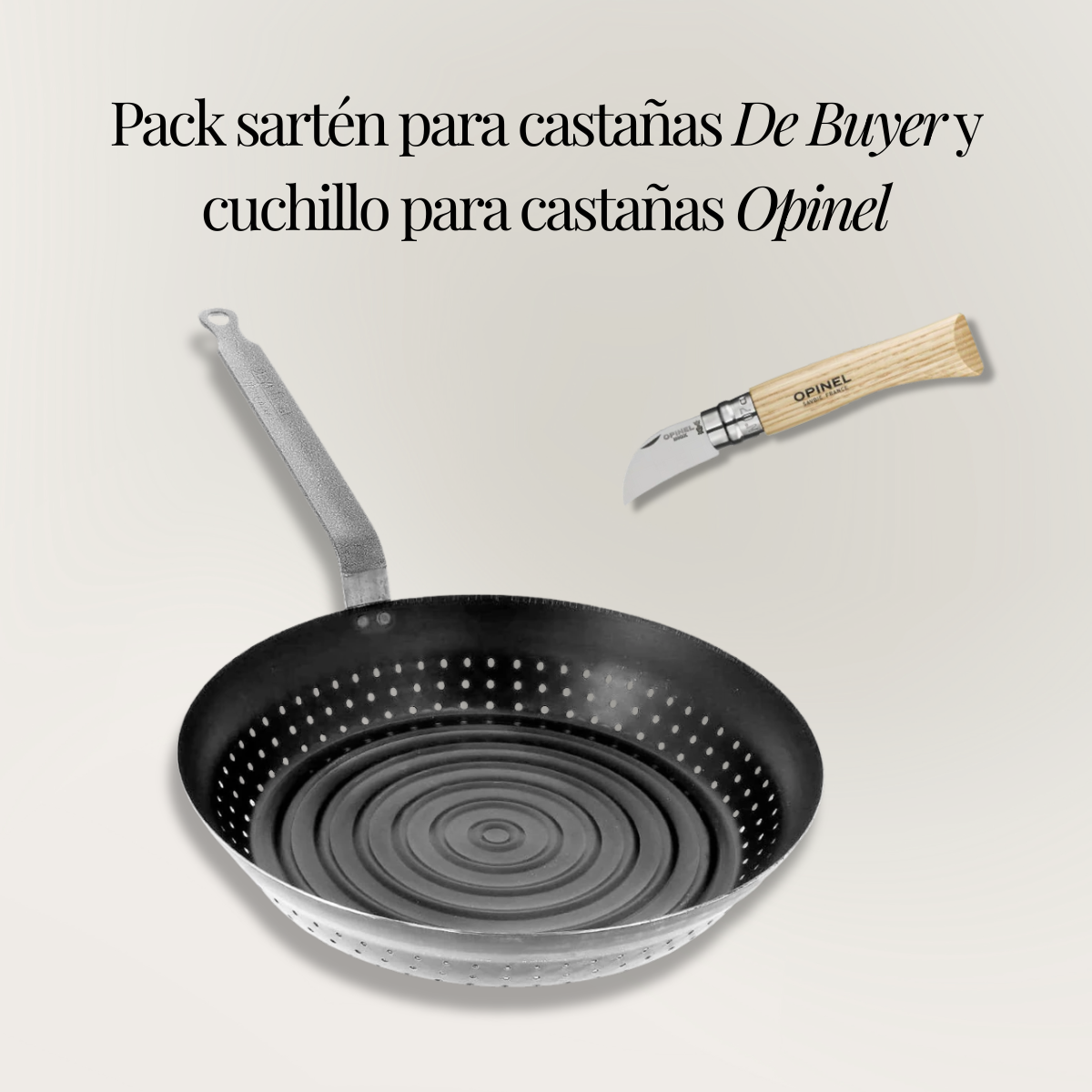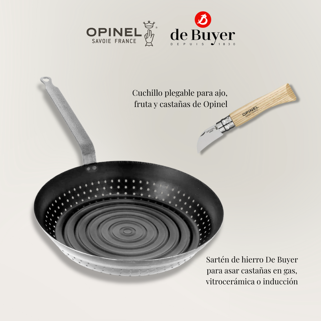 We have brought together two pieces that work wonderfully together: the De Buyer cast iron pan for roasting chestnuts, perfect for cooking them with that toasted touch we love, and the Opinel folding knife for chestnuts, ideal for making the cut before roasting and opening them effortlessly afterward. A simple, traditional, and very useful combo, designed to enjoy a good batch of hot chestnuts at home, by the fireplace, brazier, or even in the kitchen.