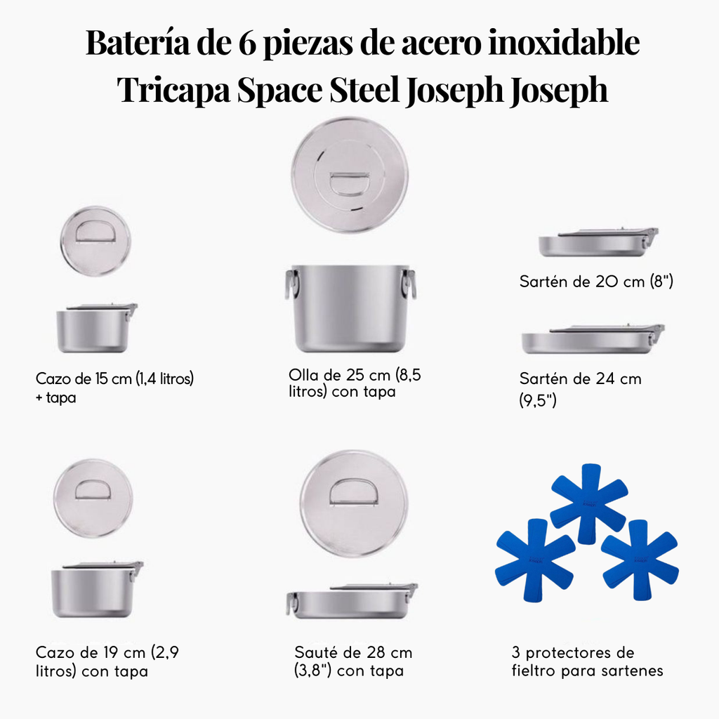 The complete 6-piece Space Steel stainless steel cookware set Joseph Joseph includes everything you need to equip your kitchen, taking up minimal space and featuring the quality of multilayer pieces for fast and highly efficient cooking, while its design allows you to occupy the least amount of space.