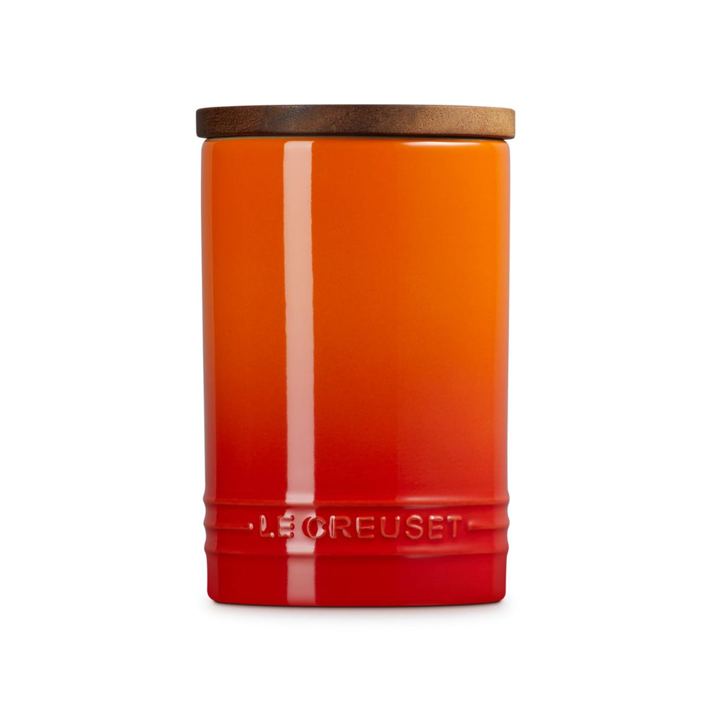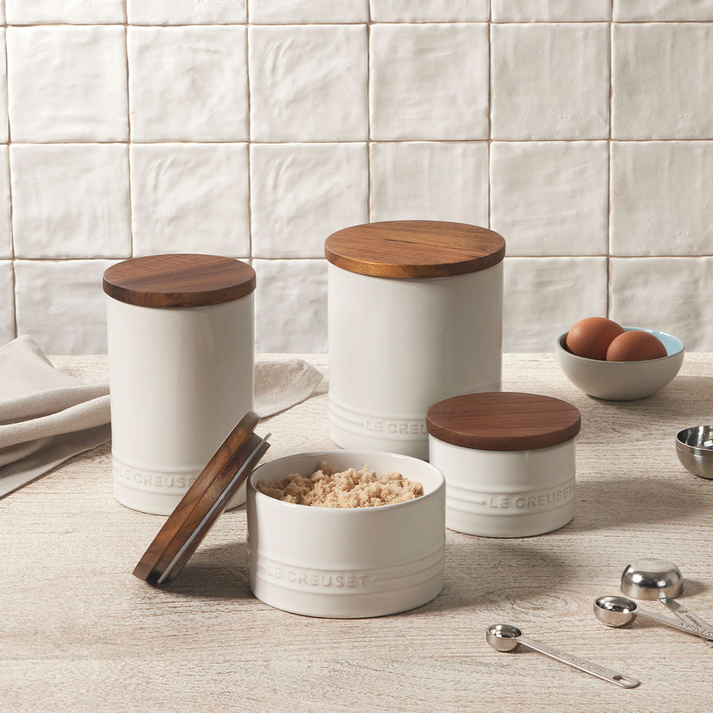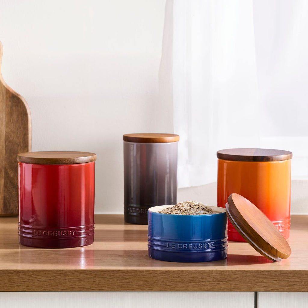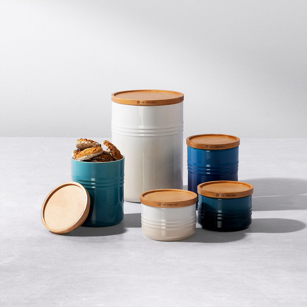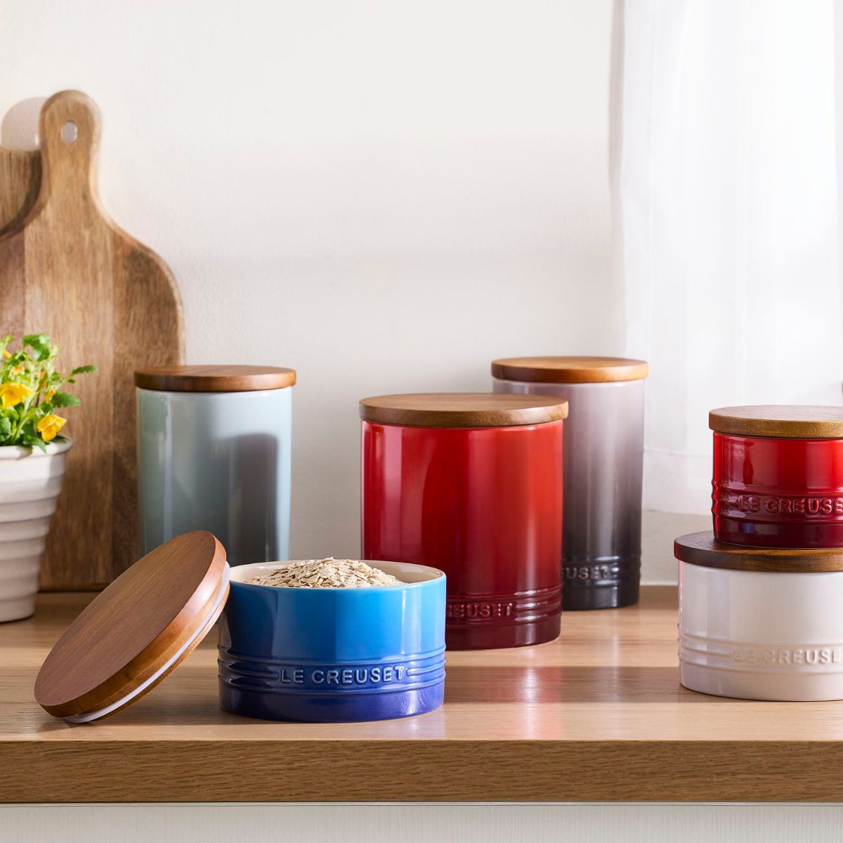 Elegant and versatile in all its sizes and colours, the new design of the Le Creuset Signature Ceramic Jar with Wooden Lid will win you over. This stoneware jar with wooden lid is highly functional. Thanks to the silicone seal on the lid, it is perfect as a storage container with an airtight closure. It’s great both for storing dry ingredients in the kitchen cupboard and for bringing sugar, salt, sauces or breadsticks to the table. Choose your size and colour – or mix and match to organise your kitchen in the most elegant way!