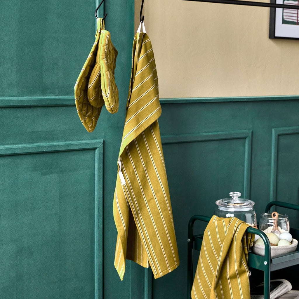 This Set of 3 Cook House Doctor kitchen towels is a set of three generously sized tea towels that will add a splash of colour to your kitchen. Made from 100% cotton and free from harmful substances, the mustard-coloured fabric features a modern design with black and off-white vertical lines, giving them a truly elegant look. They’re perfect for any kitchen, no matter your style!