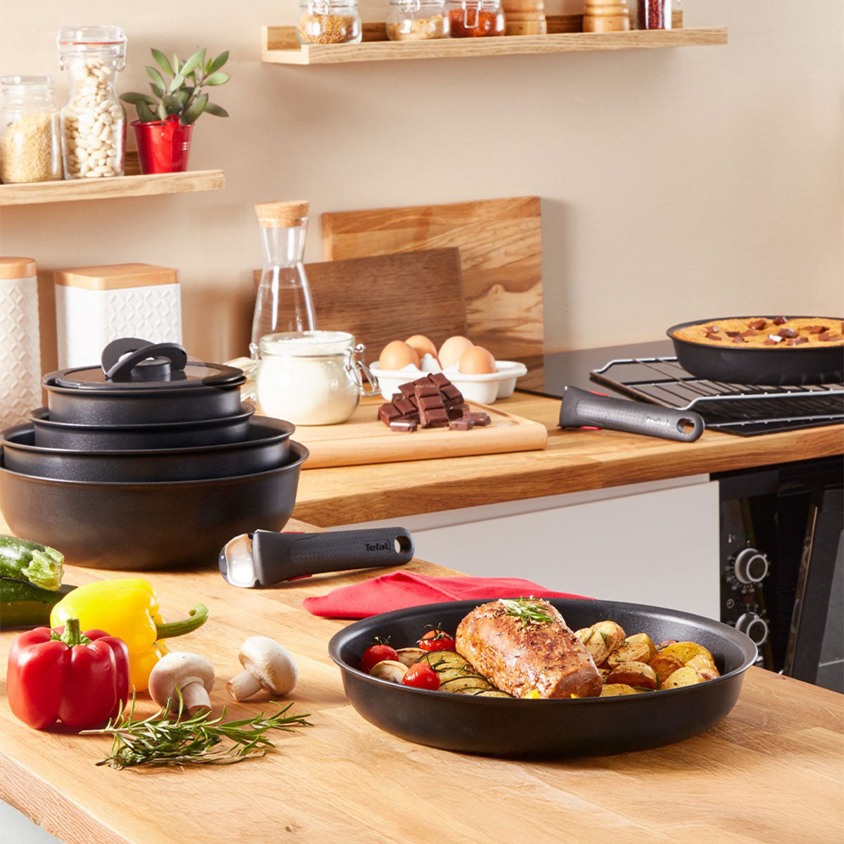 From the stove to the oven, from the oven to the table or the fridge. The Tefal Ingenio Unlimited Frying Pan Set makes it that easy. This 3-piece set is made up of two non-stick frying pans and a removable handle , which will allow you to gratinate or brown in the oven what you have cooked on the stove, take it to the table to serve or store the leftovers in the fridge, just by snapping on or removing the handle.