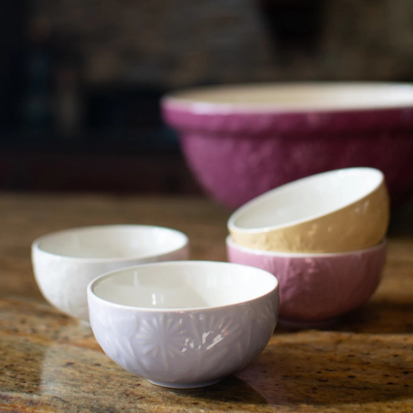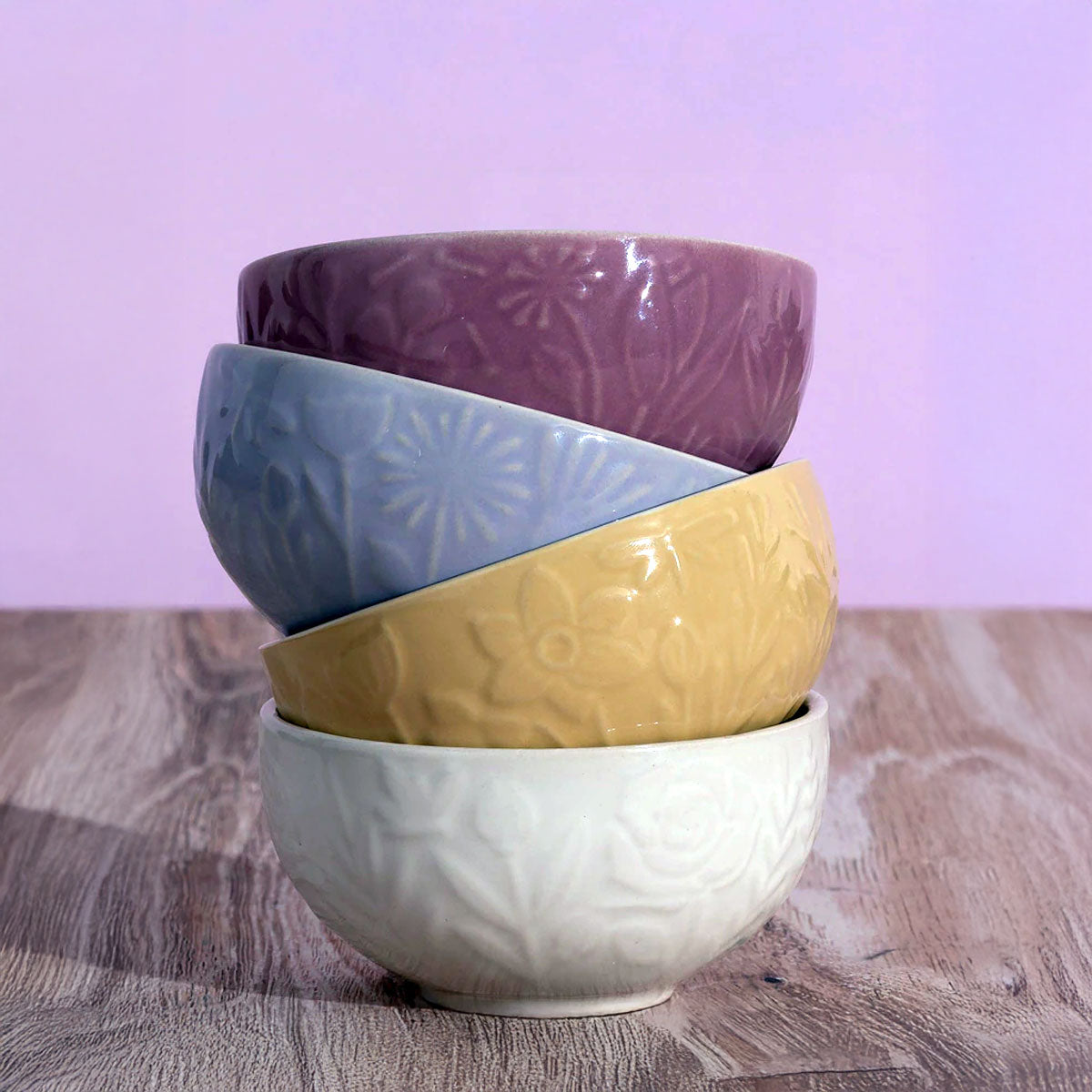 Fabricados en cerámica con un acabado esmaltado brillante, son muy resistentes por lo que son ideales para el día a día. Cada cuenco presenta un esmaltado de distinto color en rosa, amarillo, crema y lila, y en cada uno el relieve floral es diferente. El esmaltado interior de los 4 pequeños boles es de color blanco, creando un precioso contraste. La superficie esmaltada no es porosa, por lo que no absorbe olores, sabores o bacterias, al tiempo que facilita la limpieza y ayuda a mantener el brillo por mucho que los uses.