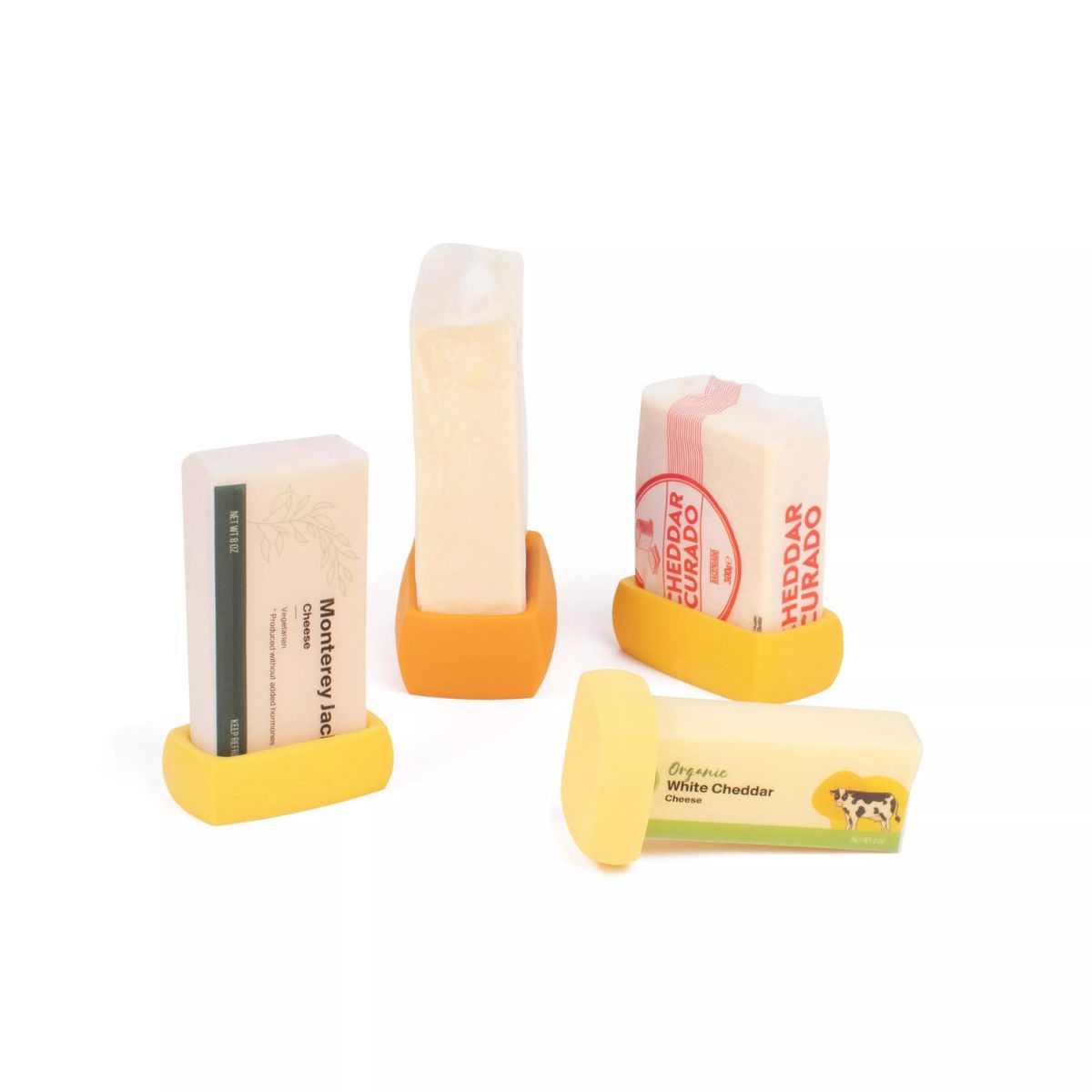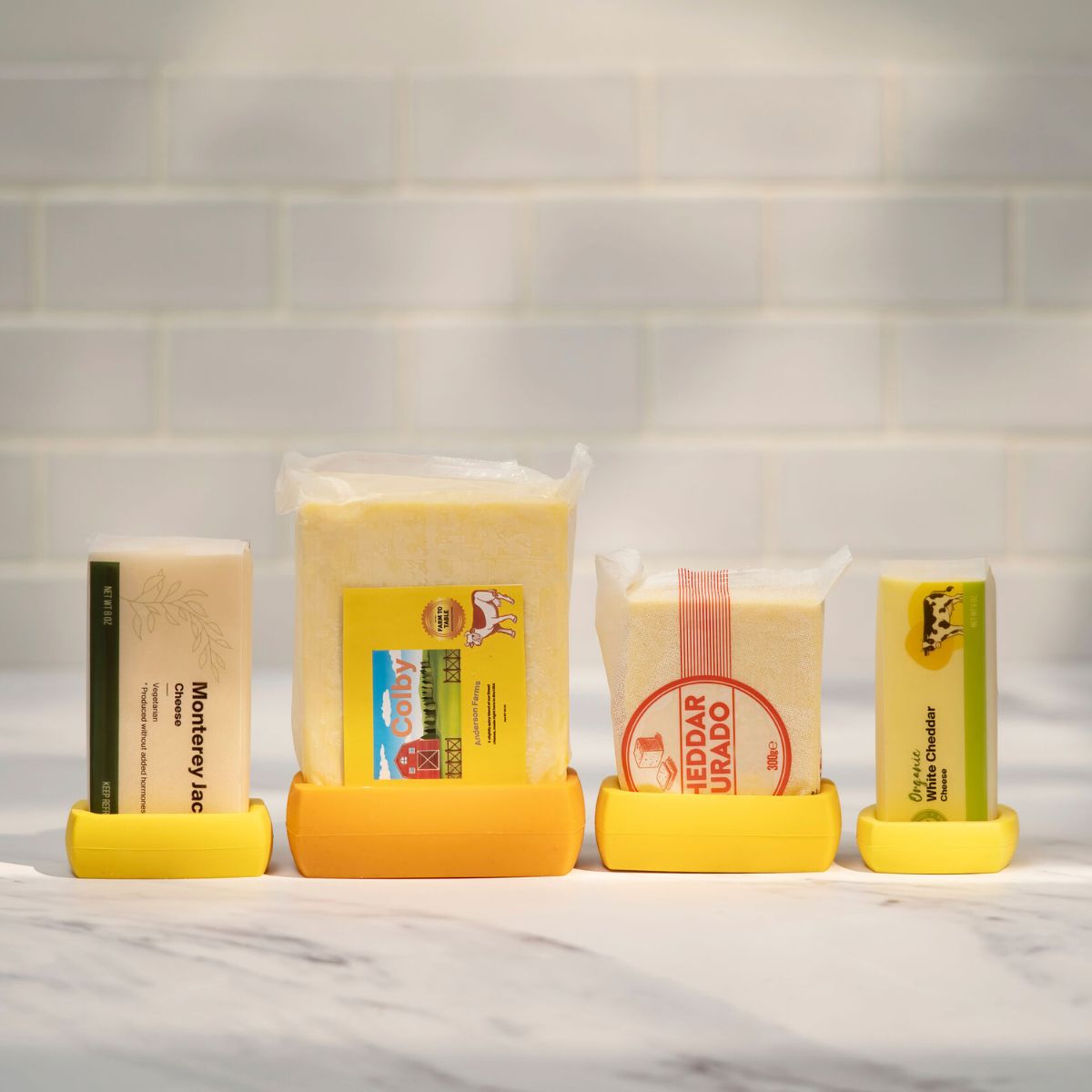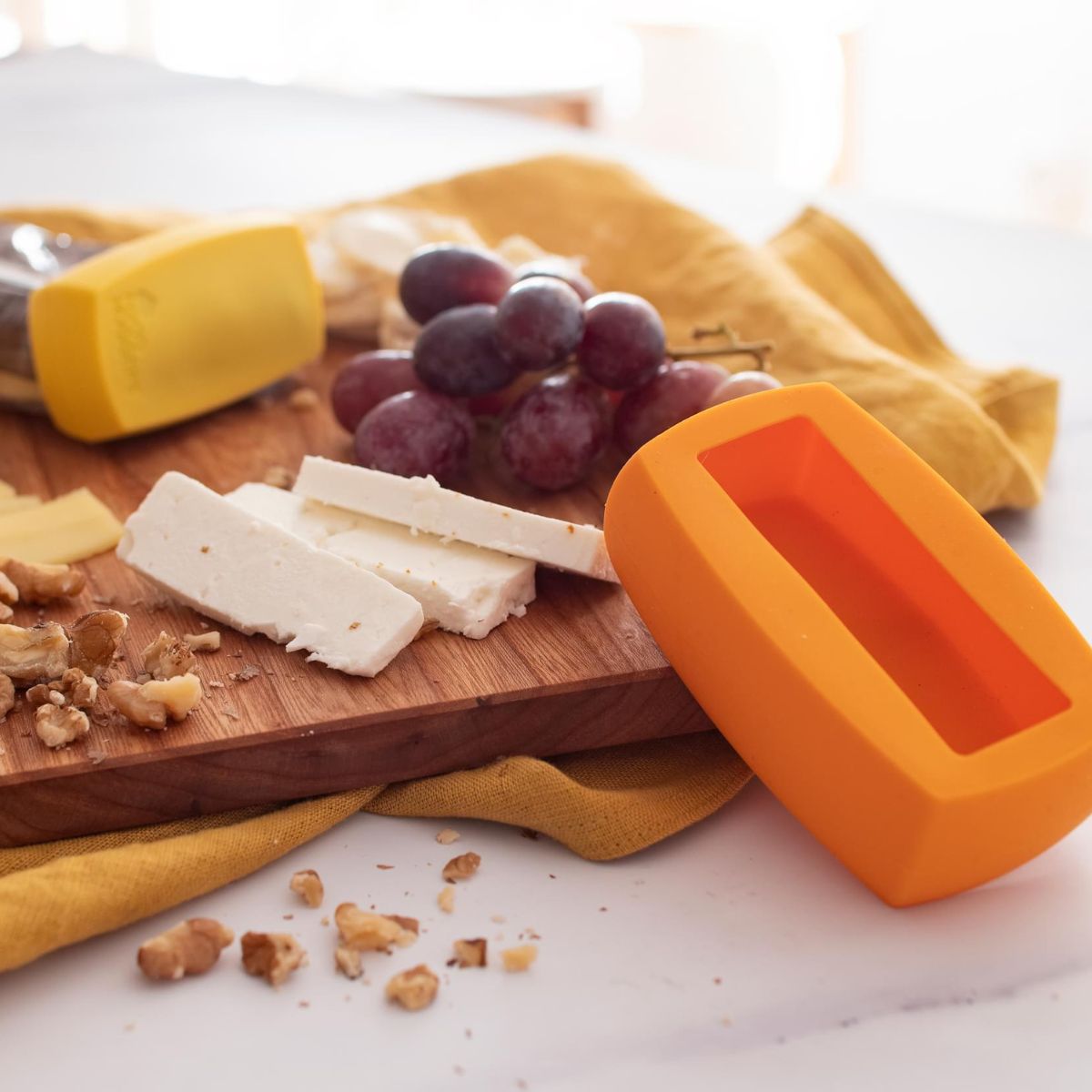 Thanks to their patented design that folds around the cut surface, the reusable silicone covers adapt easily to block cheese or other shapes, creating a secure, airtight seal that helps preserve the freshness of cheese or butter for longer. A sustainable solution to reduce food waste and keep your best cheeses safely stored without resorting to single-use plastics.