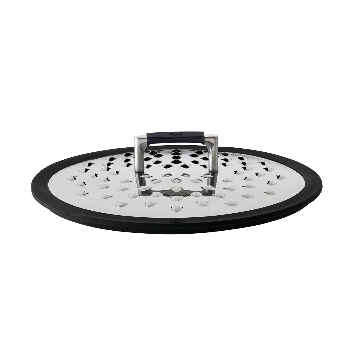 The Silence Pro splash guard lid from Rösle is made of stainless steel and features a perforated surface. This design offers several advantages over a conventional closed lid: