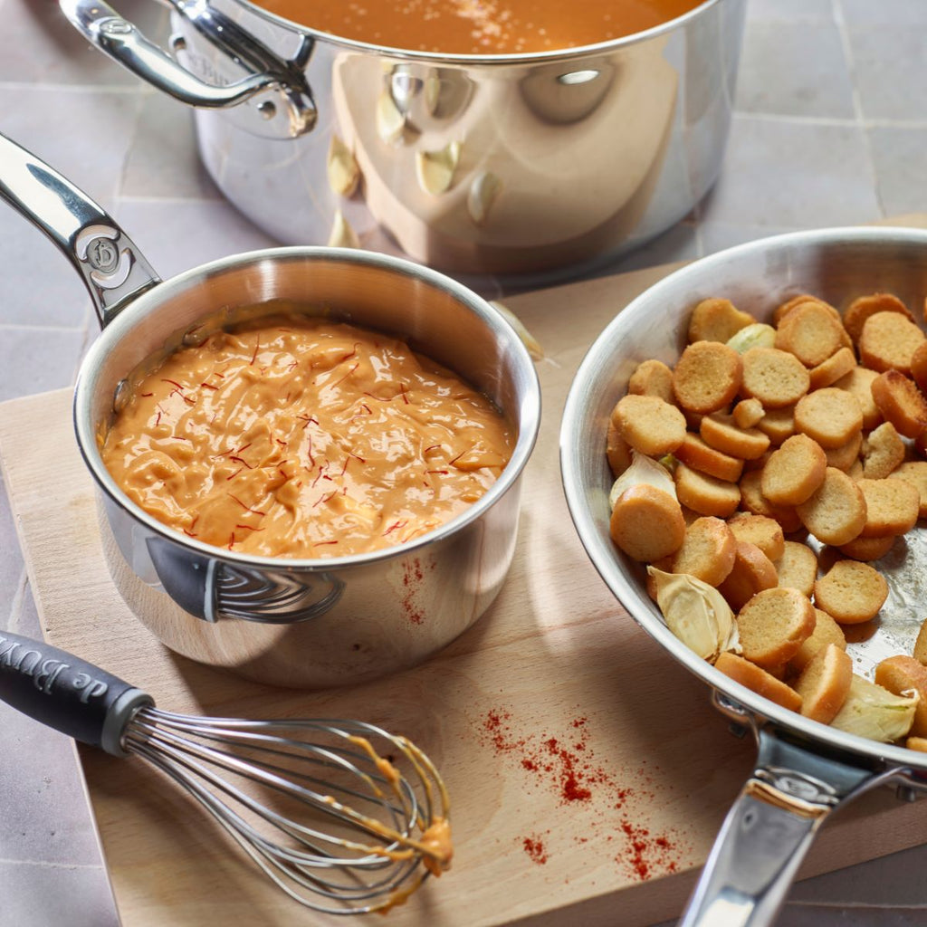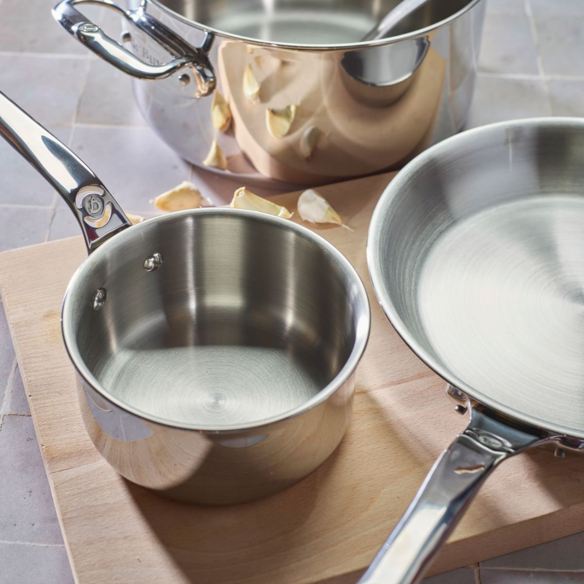 Unlike other stainless steel pans, the De Buyer Affinity series consists of 5 layers of stainless steel and aluminium both on the base and the walls of the pan. Thanks to this, not only do you get excellent heat distribution across the entire surface (not just the base, also the sides, allowing you to save time and achieve better results), but those 5 layers of steel and their density also give you optimal temperature control: you’ll see how cooking reacts quickly when you raise or lower the hob power (when you lower the heat, the pan quickly reduces the temperature across the surface, and likewise when you raise it).