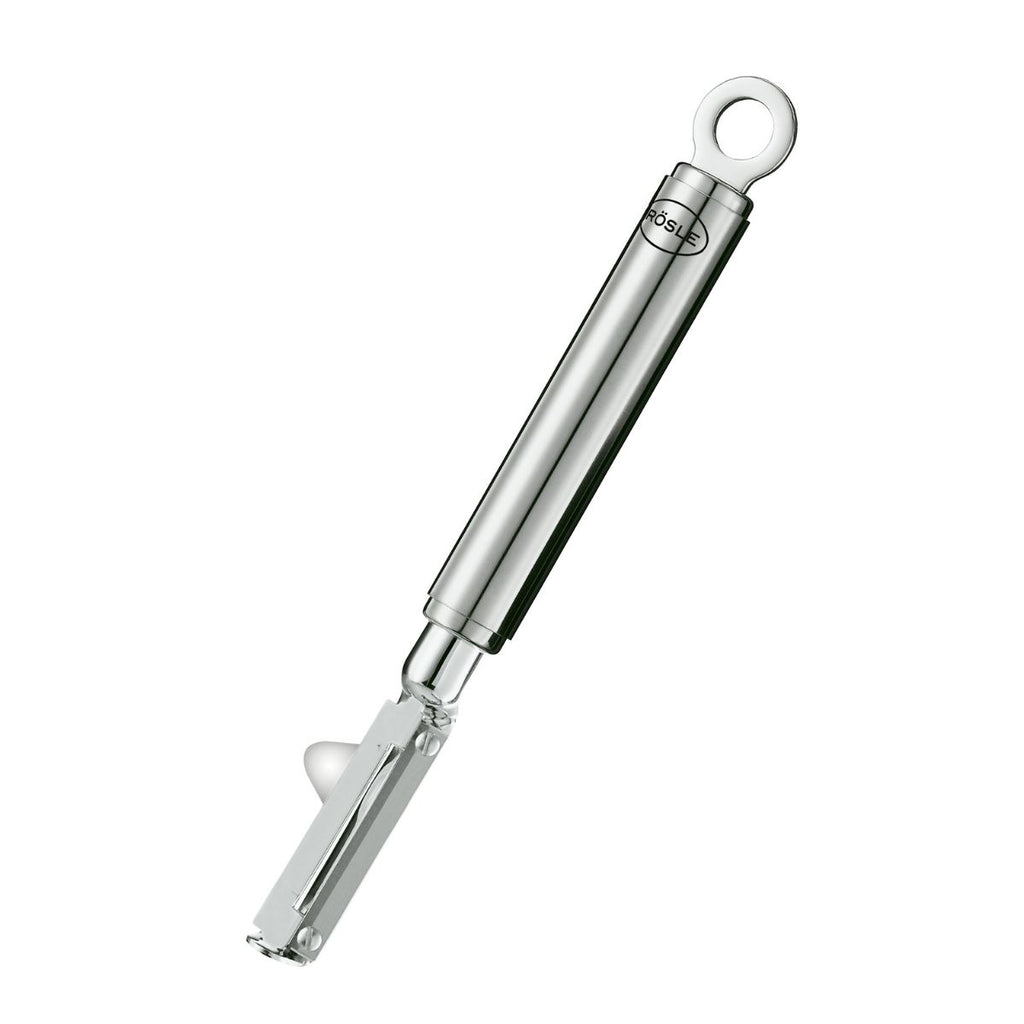 The Rösle stainless steel swivel peeler for right-handed users is perfect for effortlessly peeling all kinds of fruits and vegetables. It also features a double-ended tip that helps remove imperfections easily. Comfortable and easy to handle, it peels everything from potatoes and carrots to kiwis with ease.