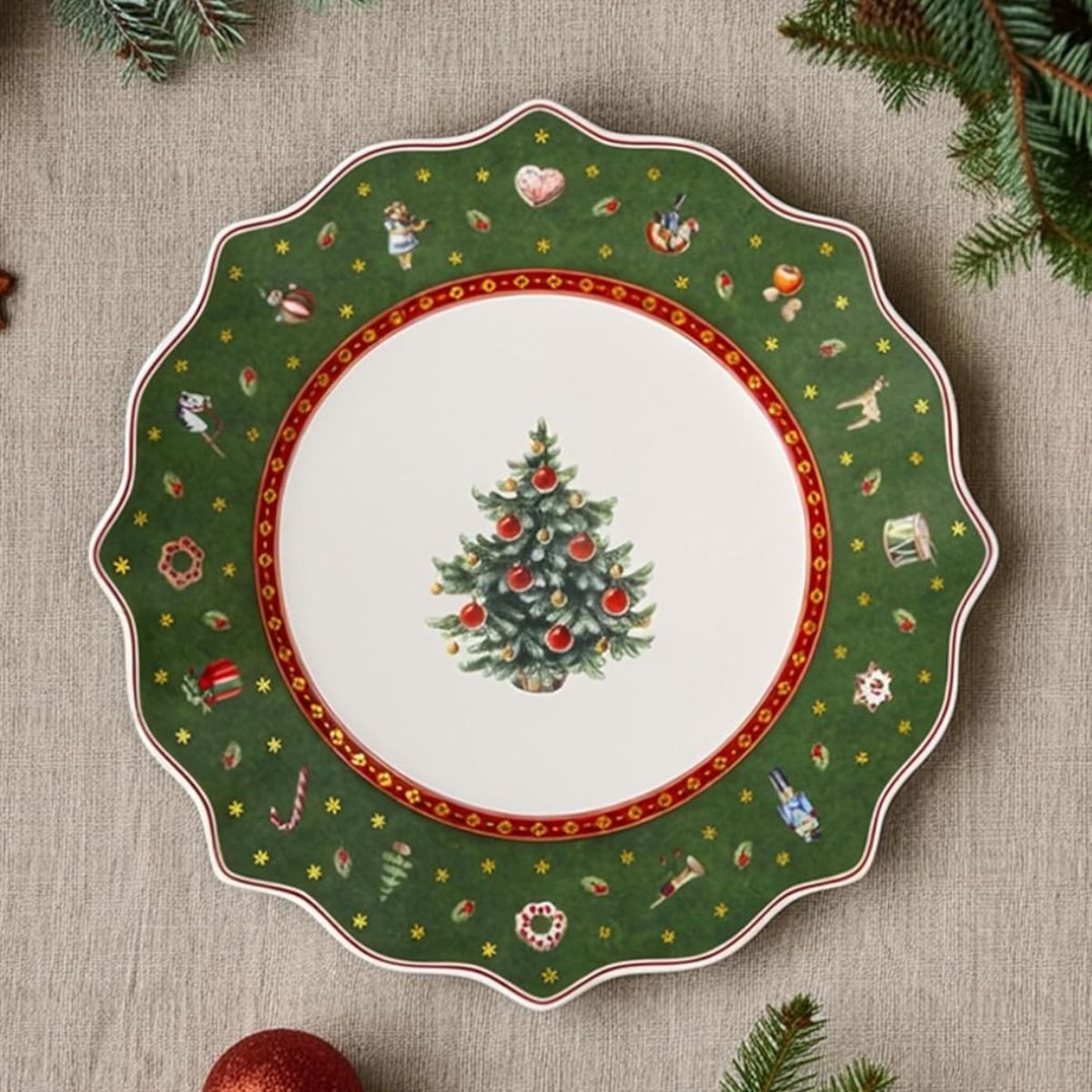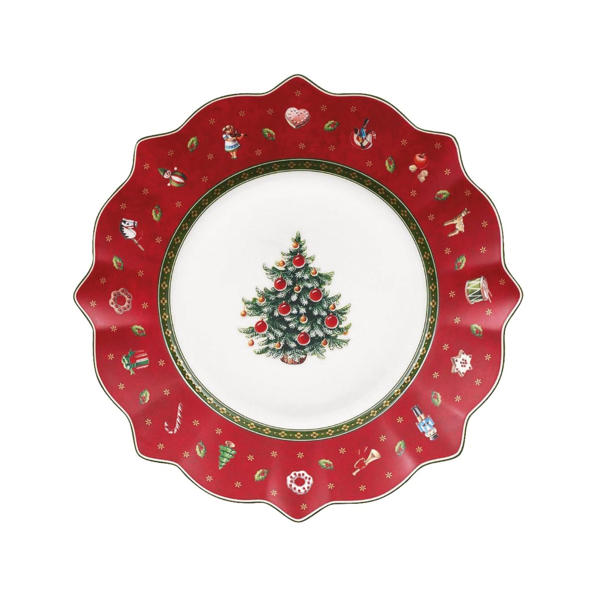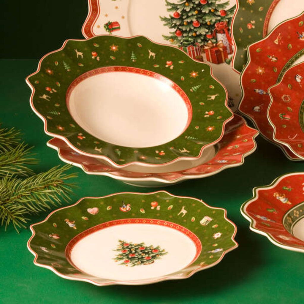 Beautiful in every colour, the Toy's Delight 24 cm Porcelain Plate by Villeroy & Boch is a must-have for your Christmas table. This flat plate will charm you with its unique and refined design, reminiscent of a classic Christmas wreath. At the centre of the plate, the decorated Christmas tree stands out, surrounded by a white, red or green border adorned with joyful motifs inspired by traditional toys. Whether as a dessert plate or tray for appetisers or starters, it’s absolutely lovely.
