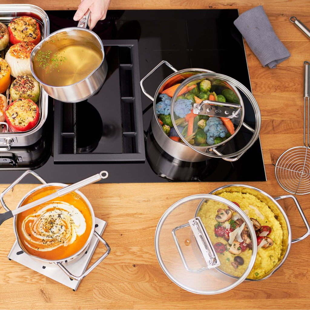 Each piece of the Expertiso cookware set has been designed by Rösle to become your best ally in preparing your favorite recipes, offering solutions for all kinds of dishes and guaranteeing tasty, nutritious, and quick results. An elegant set, of excellent quality, durability, and functionality.