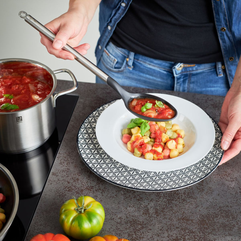 With its 38 cm length, this spoon is the perfect helper for serving all your delicious recipes at the table, whether hot or cold. And no matter how delicate your bowl, pot, mould, casserole or pan, this nylon spoon with stainless steel handle will take care of your cookware just like you do.