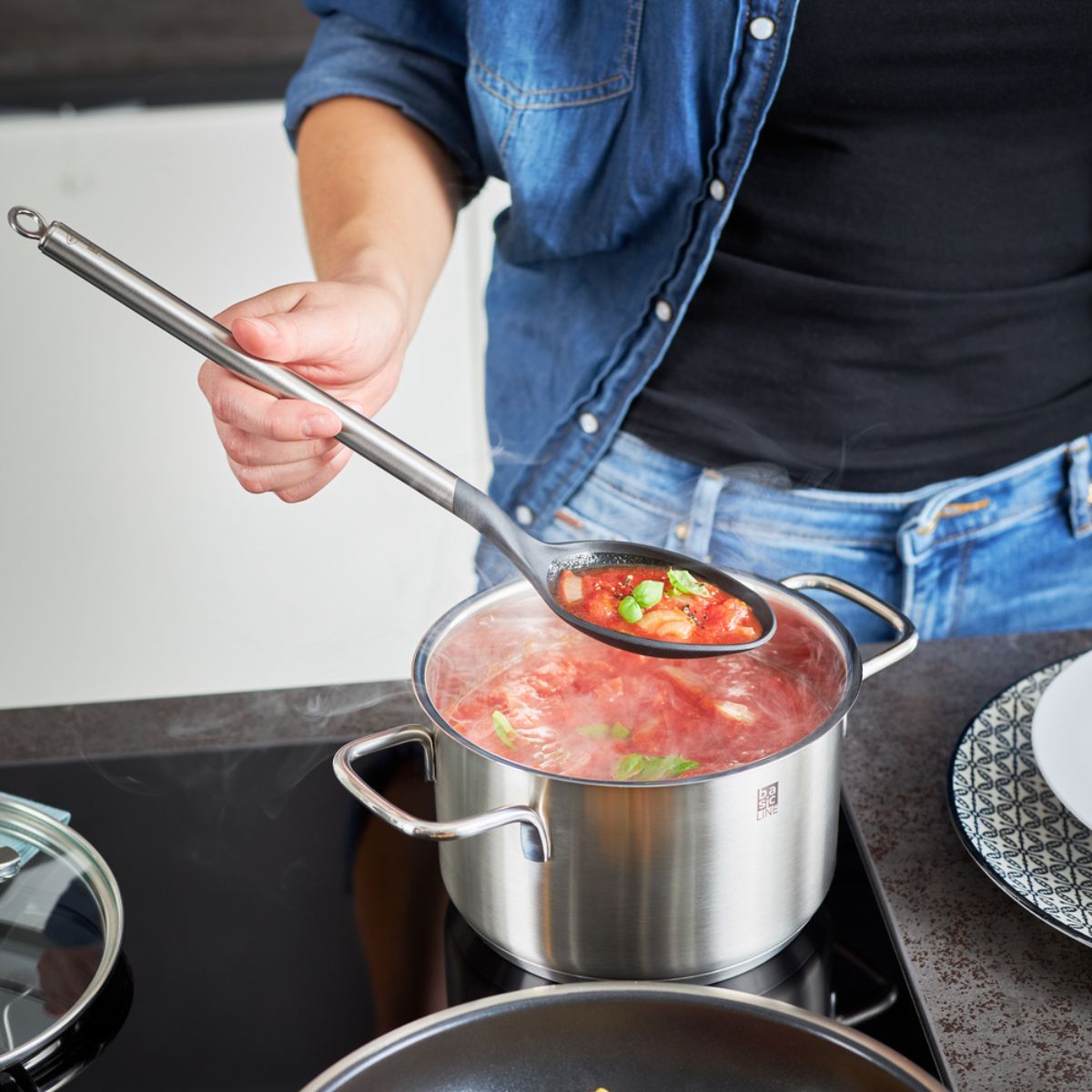 Its long, rounded handle ensures safe and comfortable handling. With a hanging ring at the end, you can store it easily and keep it within reach. Elegant, durable, very functional and heat-resistant up to 220 °C.