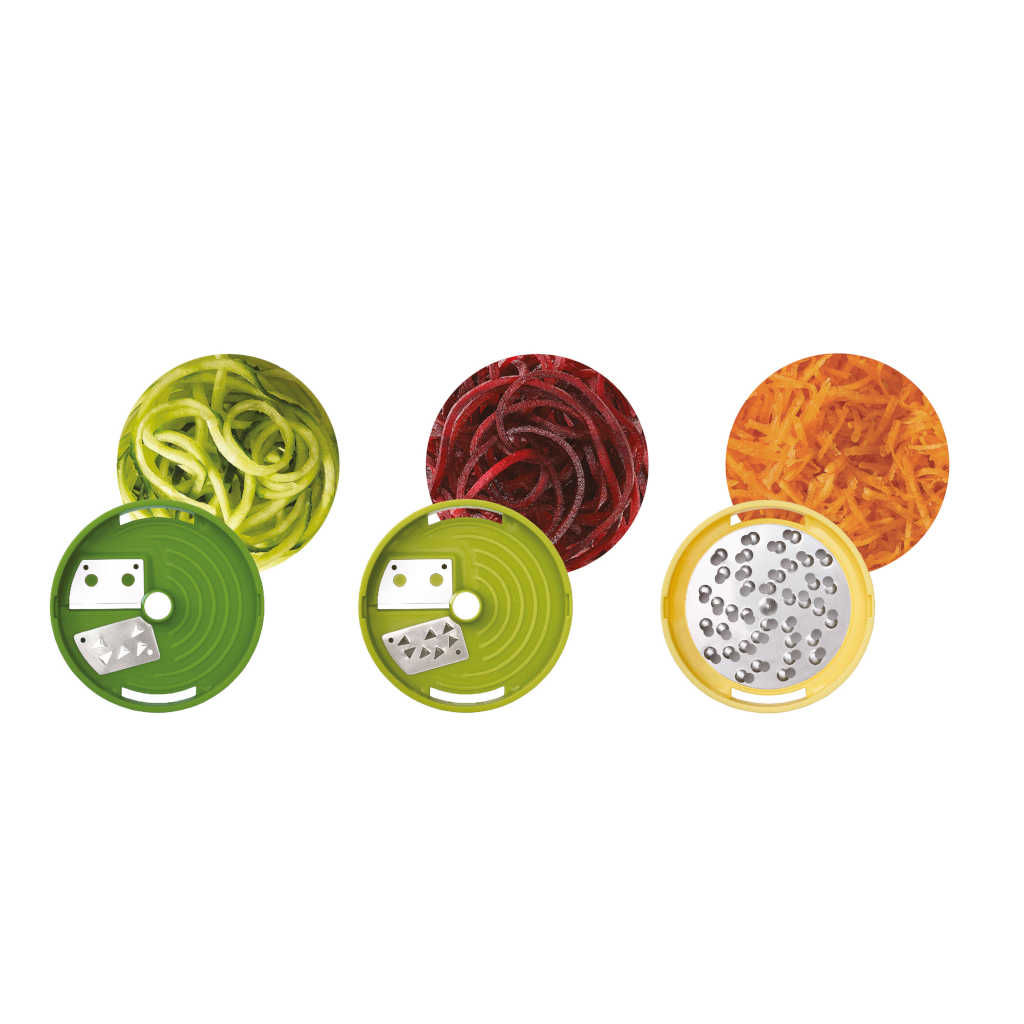 It is made up of a completely BPA-free container, two discs for cutting spirals (fine and coarse) and a third disc for grating cheese.