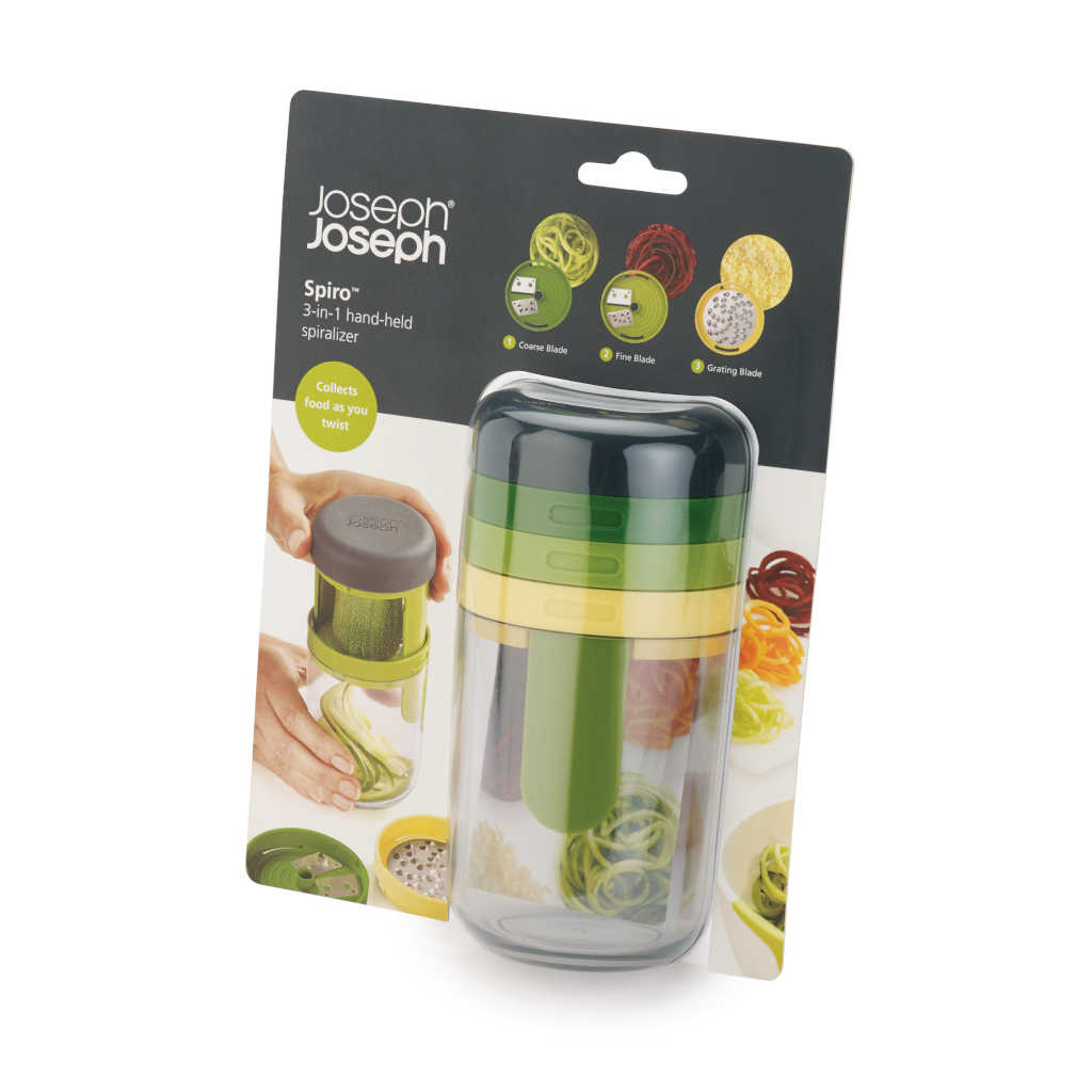 With the Joseph Joseph Spiro Spiral Slicer and Grater you can spiralise and grate vegetables in no time. It cuts beautifully, is super practical and despite offering 3 different attachments it doesn't take up any space in the kitchen.