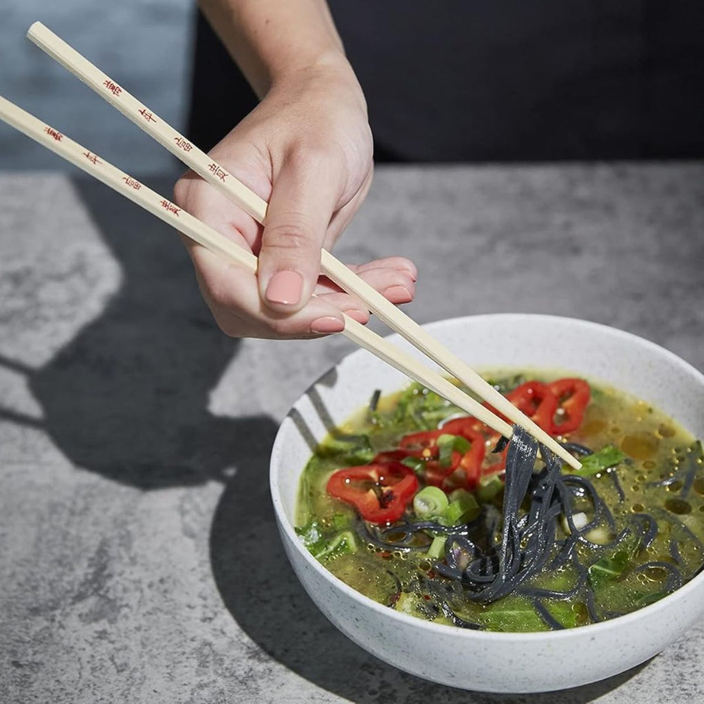 One of the great advantages of these bamboo chopsticks is that they are reusable. Made from natural bamboo wood, they feature red Asian character engravings. They are lightweight, pleasant to hold, easy to grip and to clean, designed for repeated use without hassle. Ideal for dinner with friends, family meals, or simply for enjoying your homemade ramen the right way.