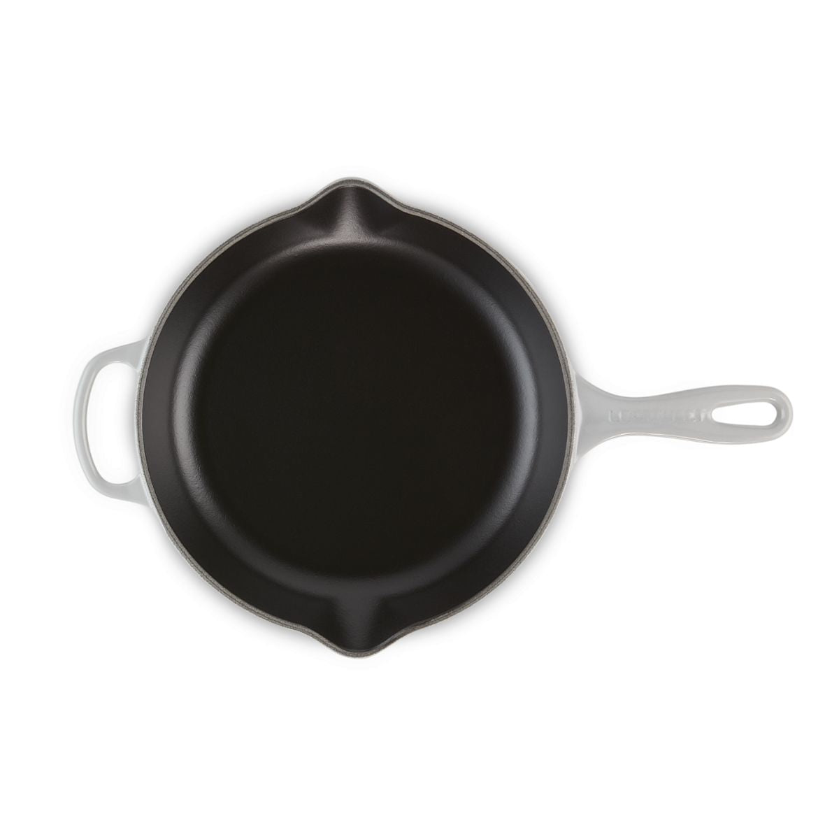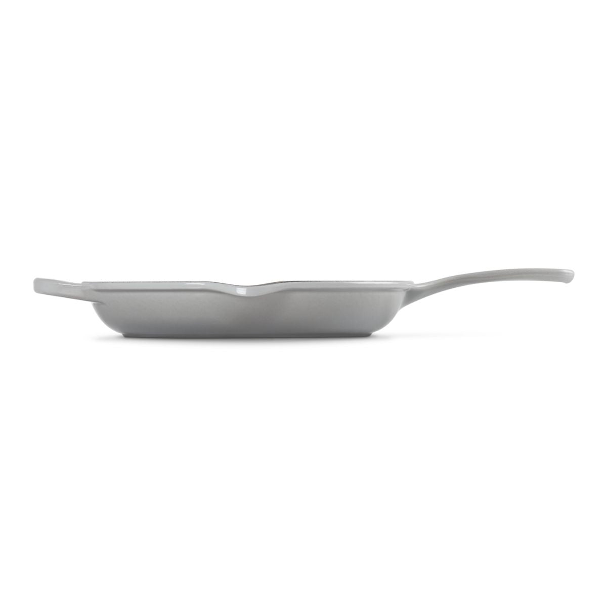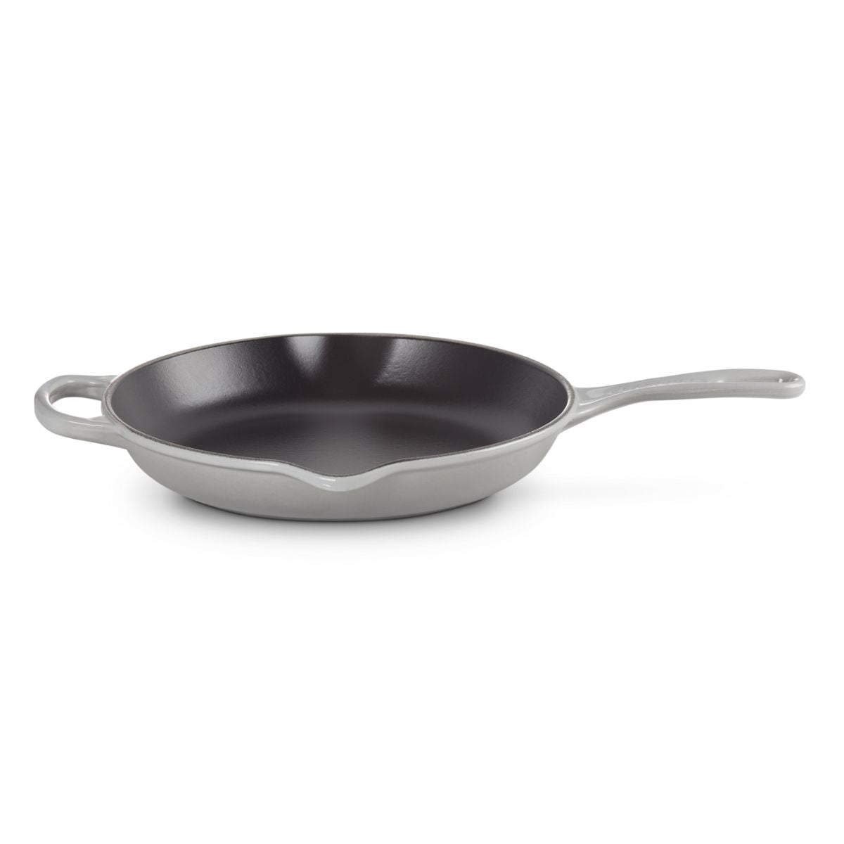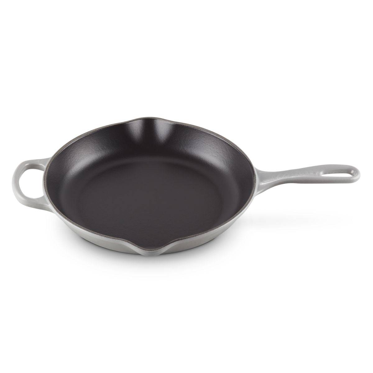 A skillet refers to a pan with low walls that gently slope outward. That’s it. In the case of Le Creuset pans, it typically refers to the classic cast iron pan with an integral handle, available in flat or ridged bottoms, round or square shapes.