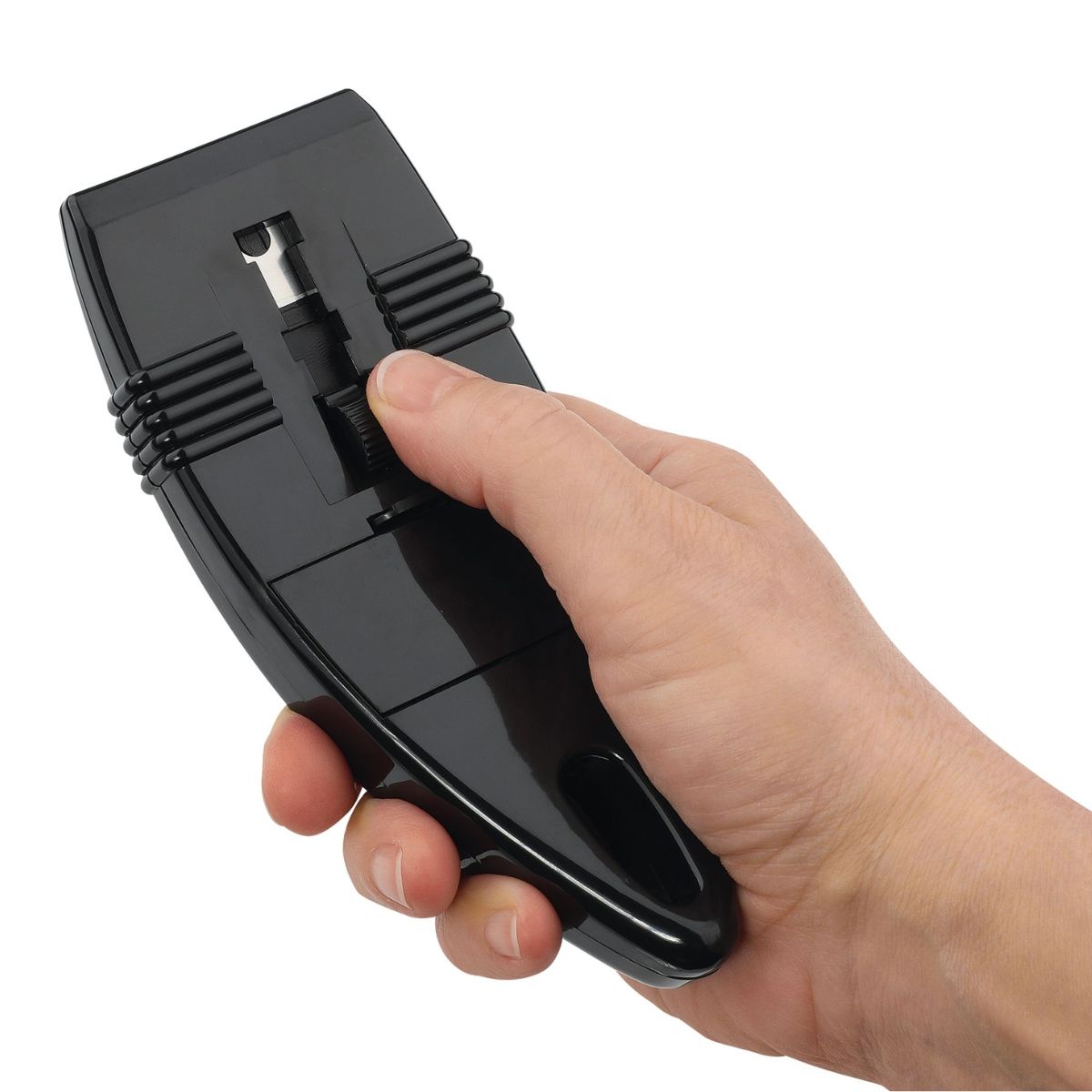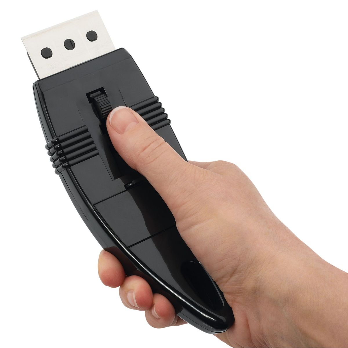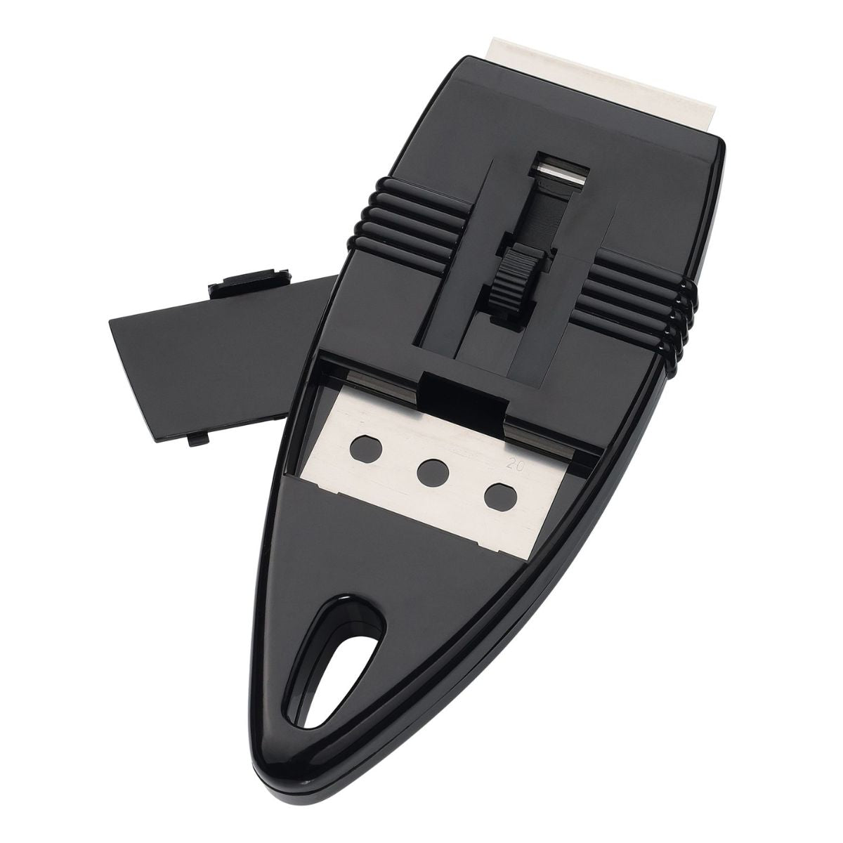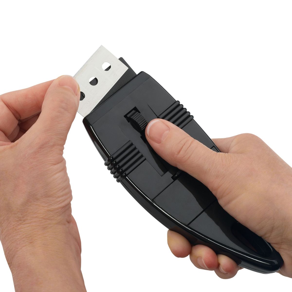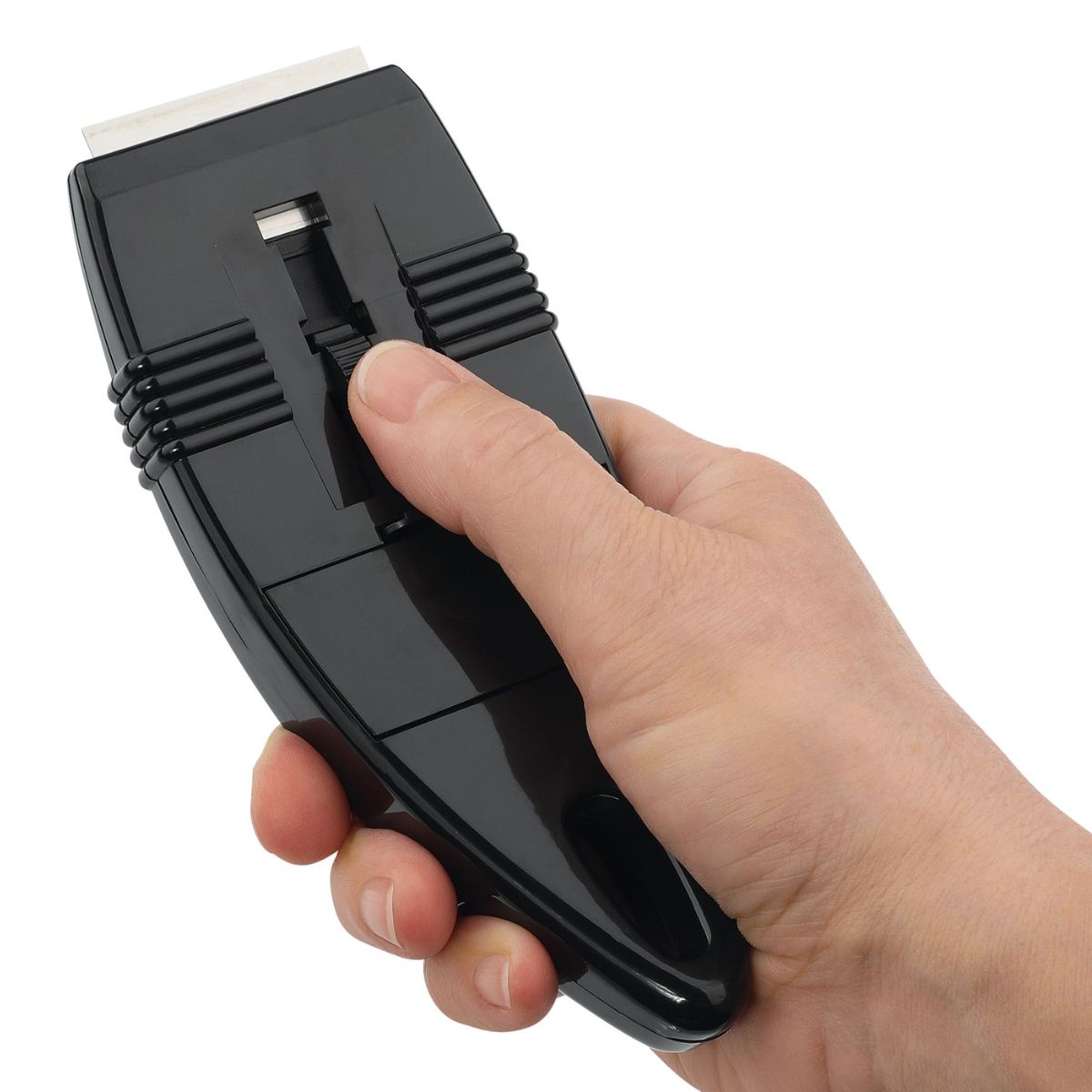 The blade is hidden away so you can store the scraper safely . When you need it, just press the small button on the back and the blade will be visible so you can use it.