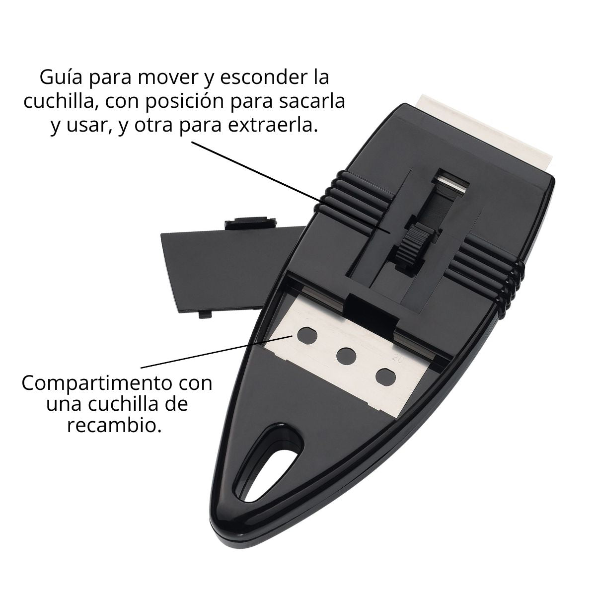 The scraper comes with two blades , one ready to use and a spare one in its lower compartment. It takes up very little space, so you can store it in any corner. And since it has a hole at its top, you can hang it if you prefer.
