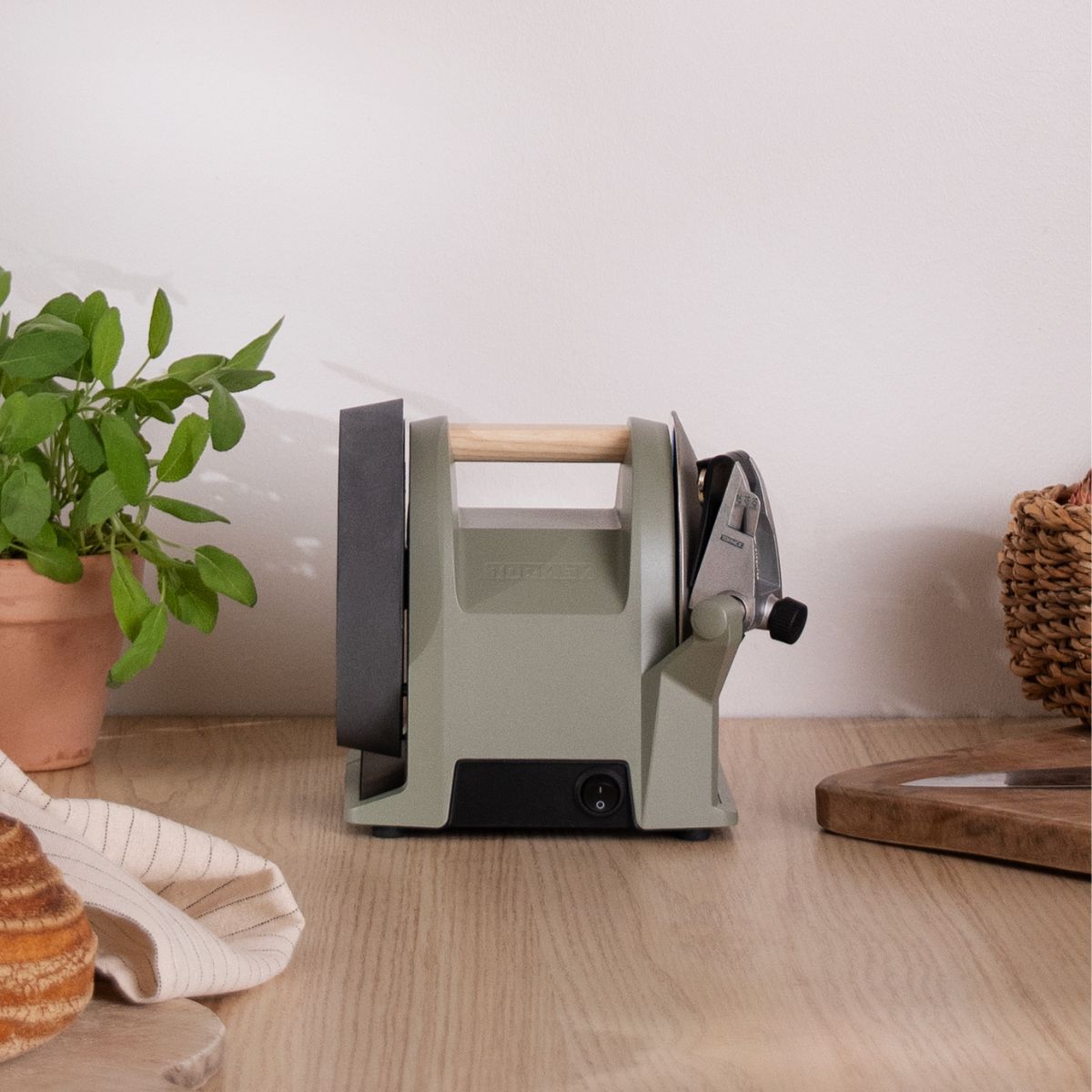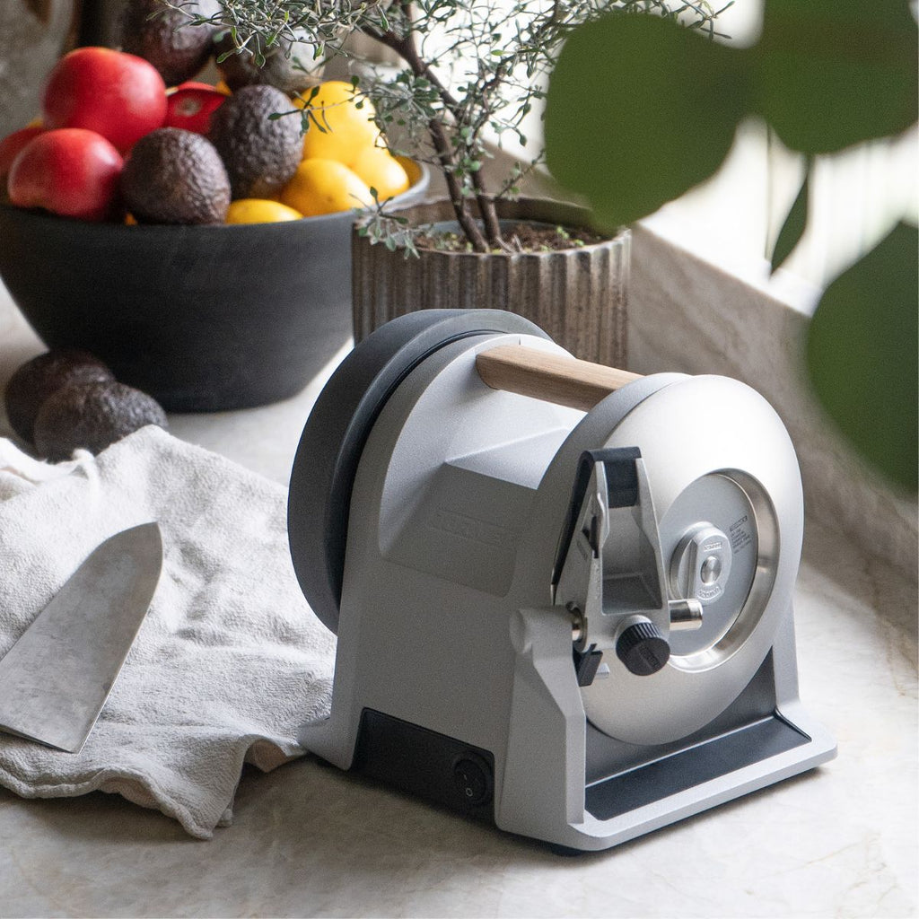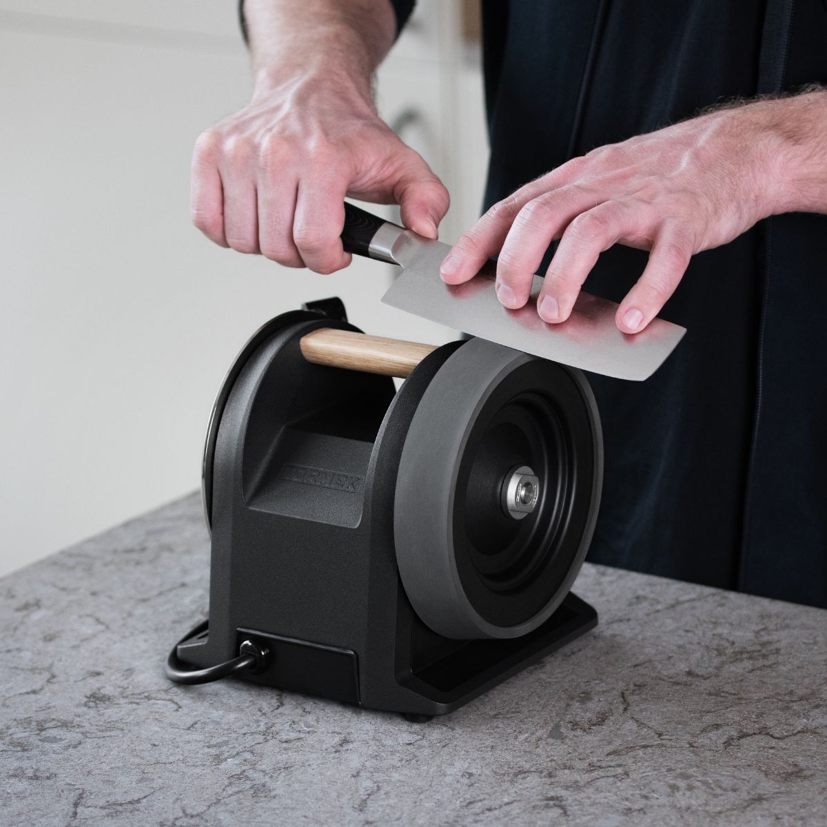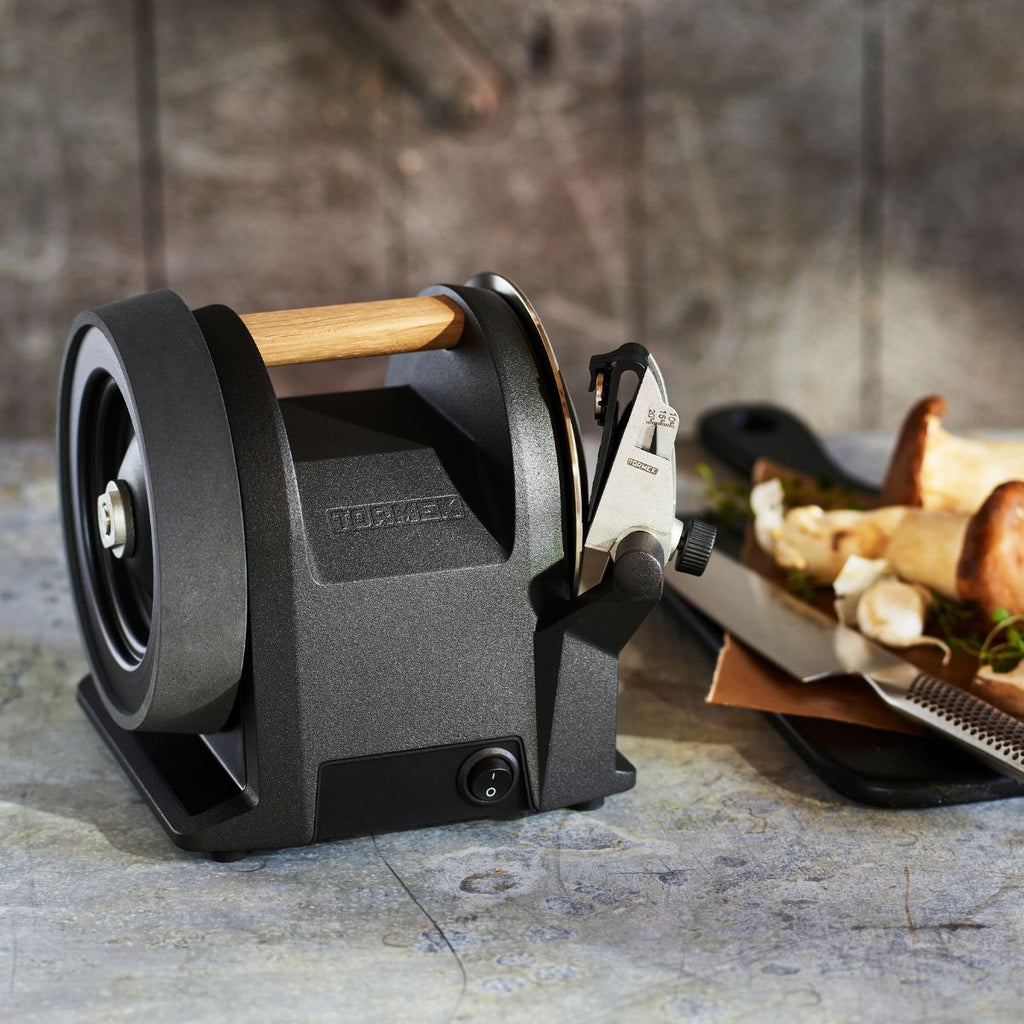 Because your knives are your best tools, they deserve the best sharpening. The Tormek T-1 Knife Sharpener guarantees professional sharpening at home. This electric sharpening machine, developed and manufactured in Sweden, is designed for domestic use. Its simple operation, high efficiency, and excellent durability mean your kitchen knives will be perfectly sharpened, ready to cut, peel, fillet, carve or chop as if they were brand new.