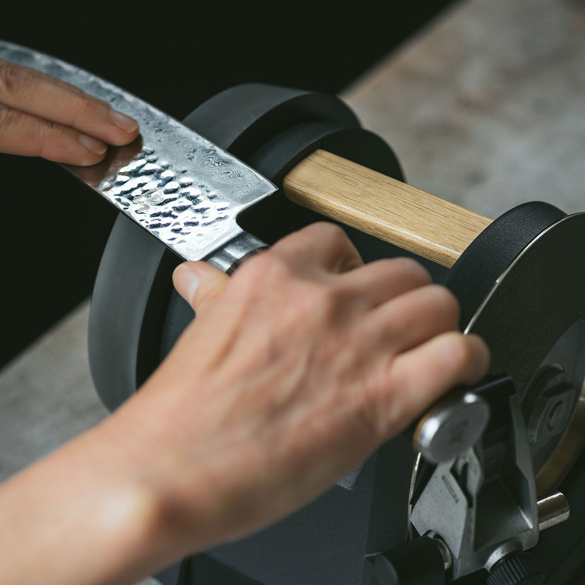 3. Hone: The final step is honing the knife. Sharpening creates a burr on the edge, which should be removed on the honing wheel to achieve a razor-sharp, durable finish. Ensure the honing wheel rotates in the opposite direction of the edge and move the knife back and forth with light pressure. Flip the knife and do the same on the other side. A couple of passes on each side is enough. Done! Your knife is as good as new—razor sharp and ready to cut.