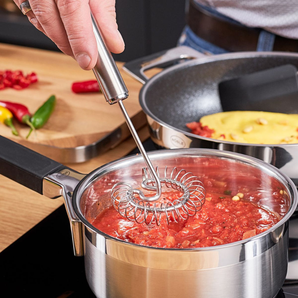 Il y a un avant et un après l’avoir utilisé — une fois que tu l’auras essayé, tu ne voudras plus t’en passer ! Robuste, durable, hygiénique, très efficace et fonctionnel, cet ustensile est l’une de ces inventions qui rendent la cuisine bien plus simple et confortable. De plus, ses 27 cm de long en font un outil idéal aussi bien pour un bol que pour des casseroles plus profondes.