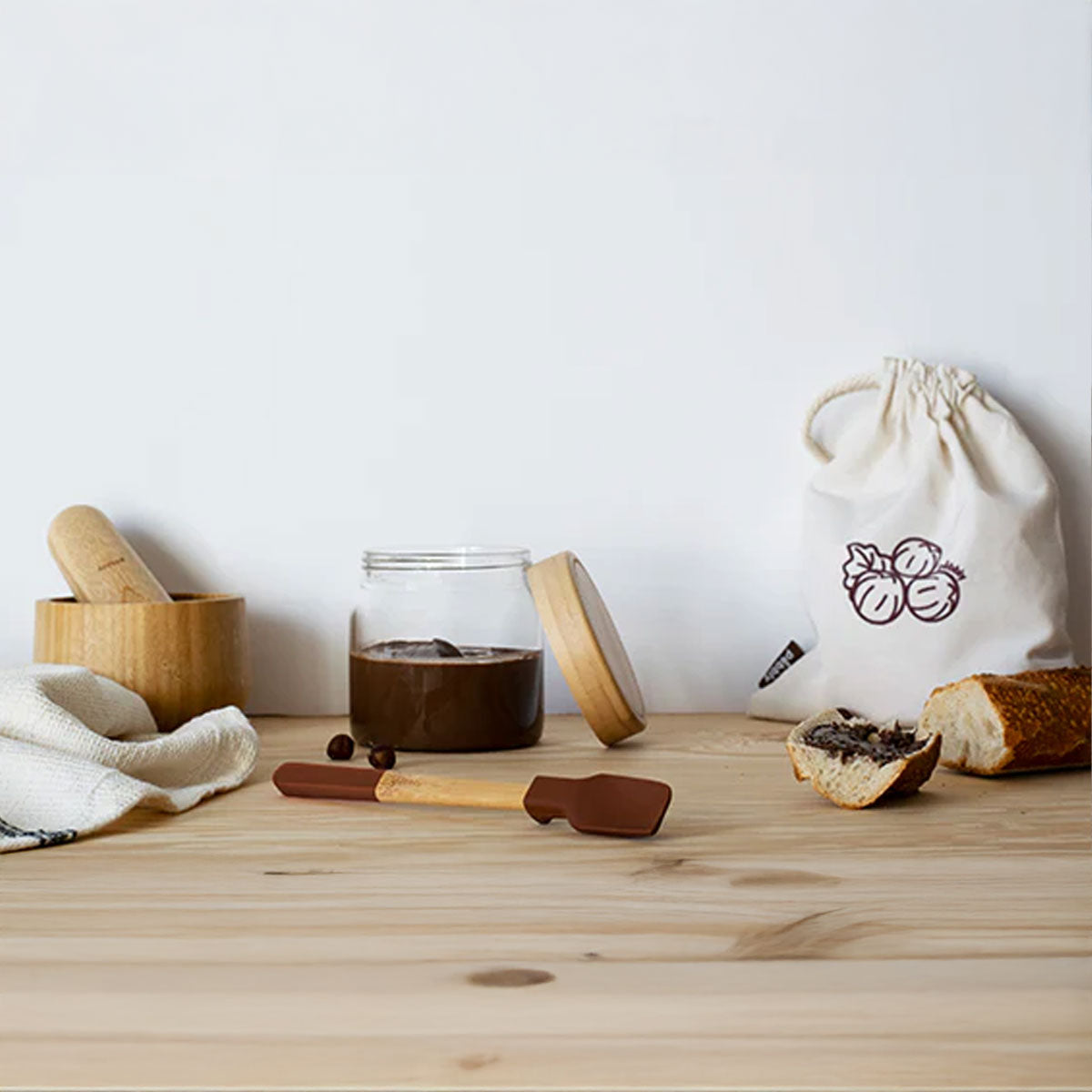 Le set comprend un sac pour conserver les fruits secs destinés à vos tartinables ou les restes, un récipient pour stocker, présenter et conserver vos préparations, et un couteau ou une spatule parfaite pour tartiner vos tranches de pain et toasts.