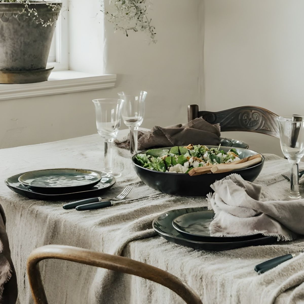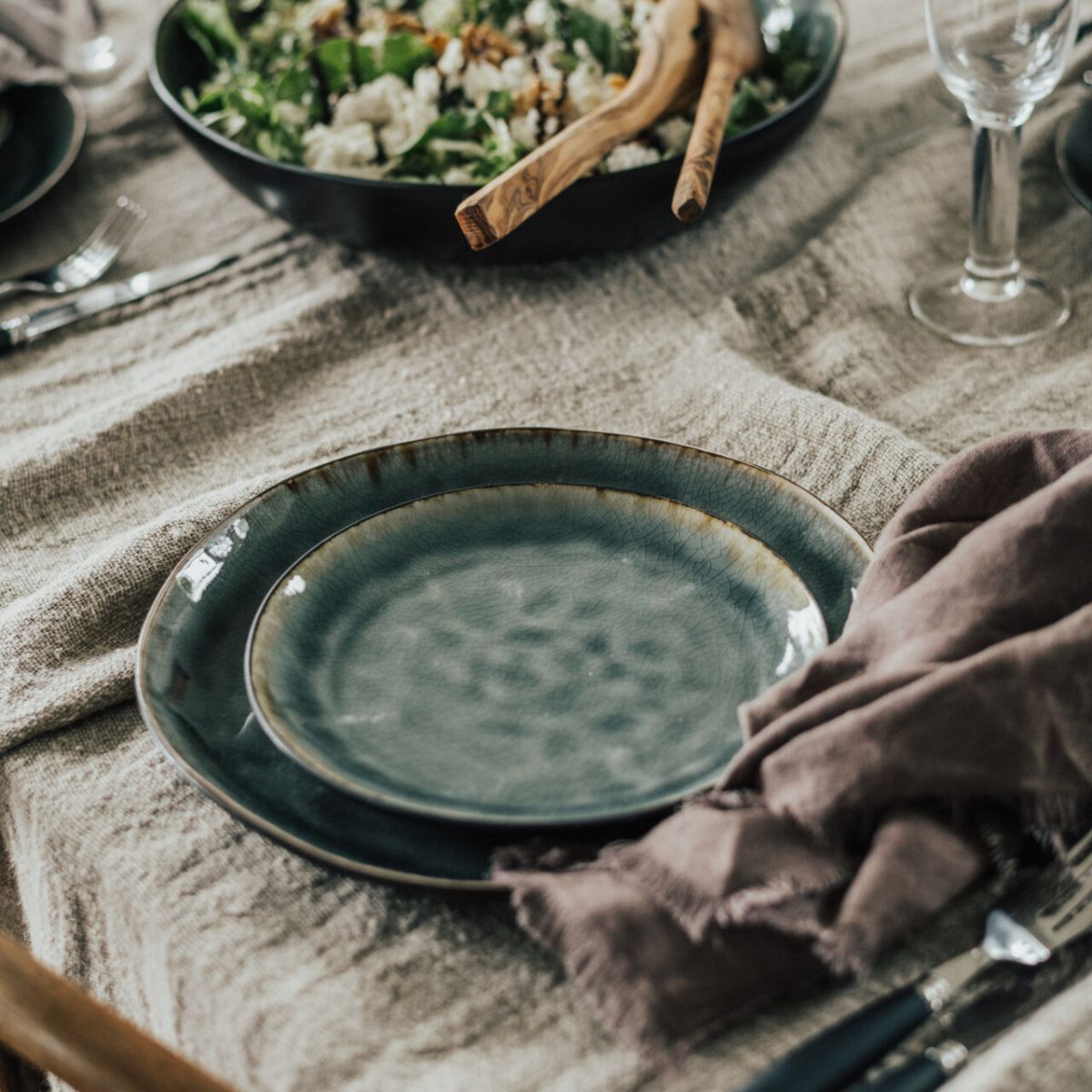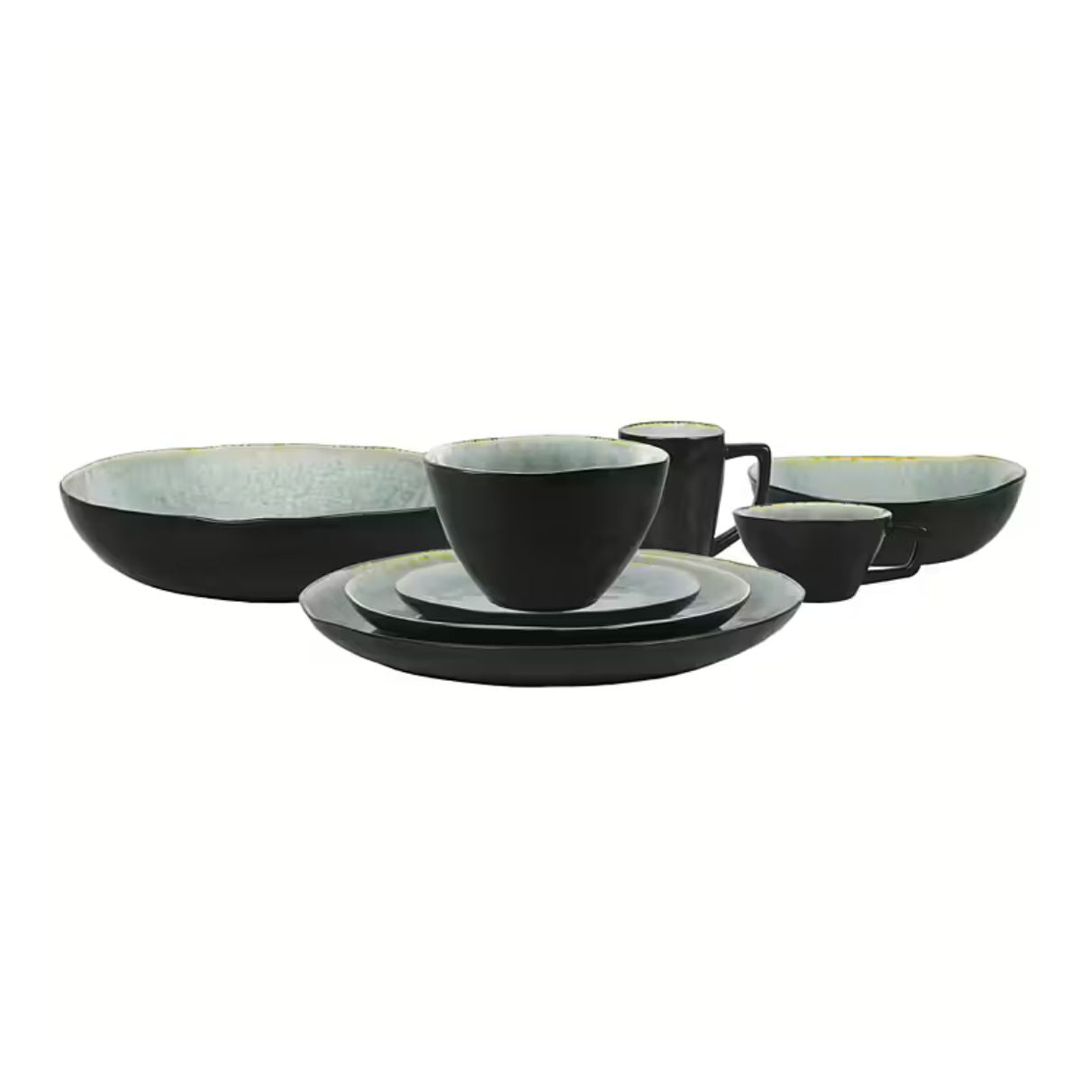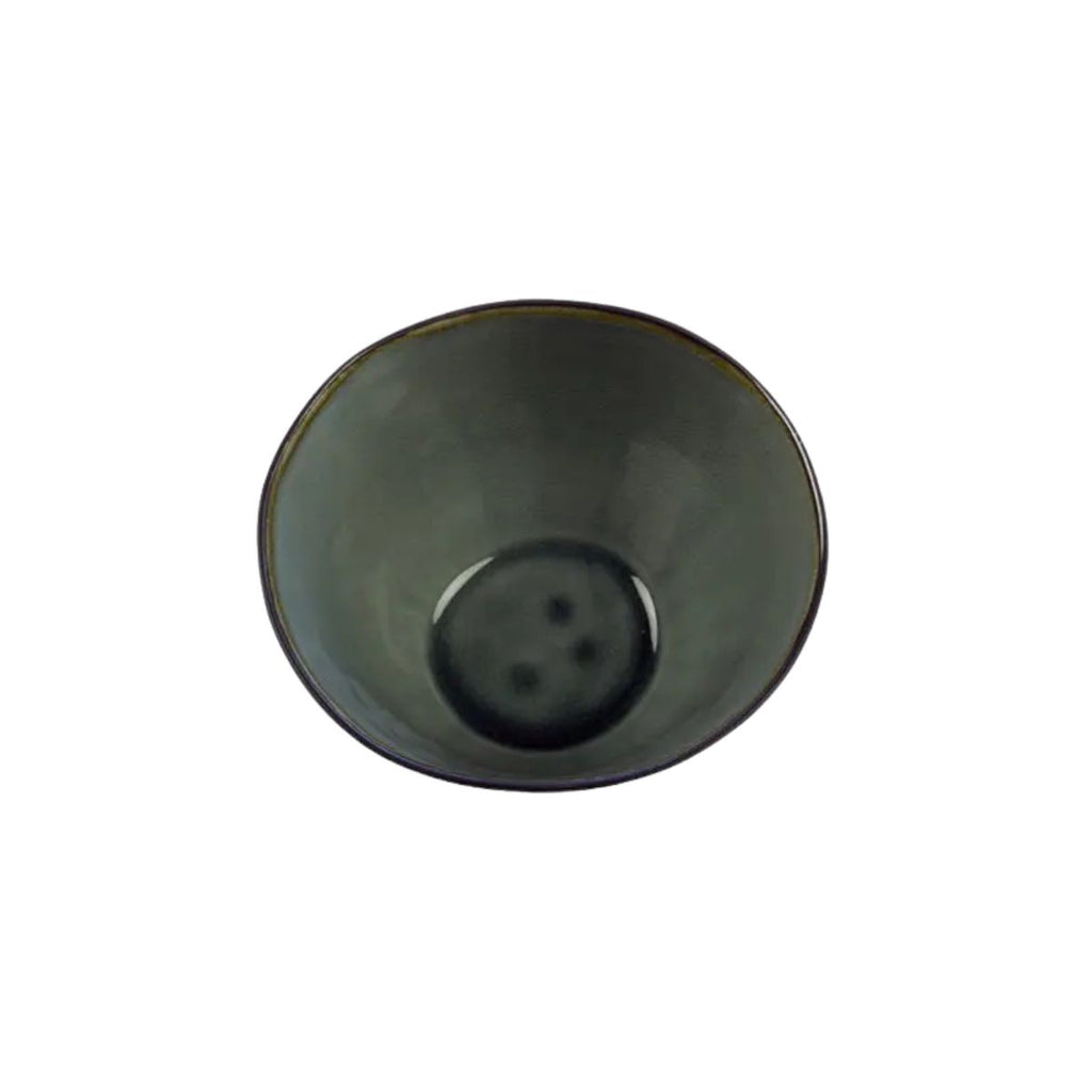 Le bol Vega combine un extérieur en ton noir mat avec un intérieur émaillé d'un vert craquelé magnifique, profond et nuancé qui change légèrement selon la lumière. Ce contraste de couleurs lui confère beaucoup de personnalité et de chaleur, en faisant une pièce qui ne passe pas inaperçue.